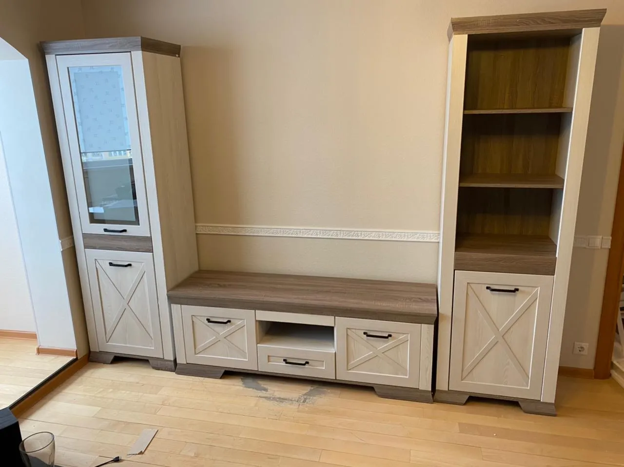 Ящички и дверцы в этом комплекте открываются очень тихо и без особых усилий. Аккуратный внешний вид и качество материалов на высоте. Муж отказался от дополнительной услуги по сборке и собрал все составляющие воедино самостоятельно. Очень помогла инструкция на русском языке. Размеры идентичны указанным на сайте и мебель как раз подошла для нашей гостиной.