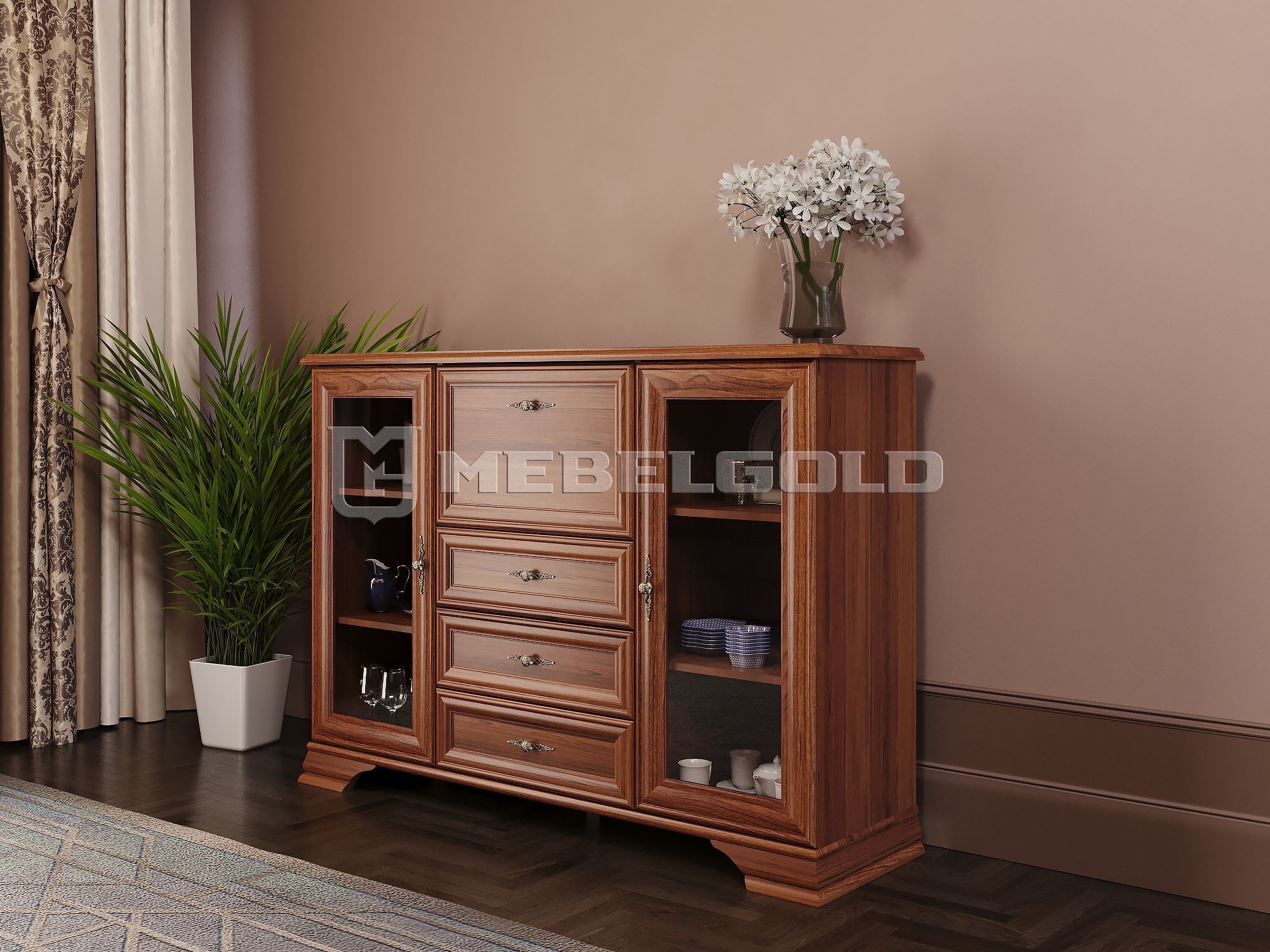 По сравнению с комодом линейки Kentaki каштан тумба отличается большей вместительностью и гармоничным видом. Это модель с расширенным объемом функций, в которой кроме трех выдвижных ящиков есть одно отделение и две распашные двери с полками внутри. Она легко заменит витрину и позволит хранить за стеклом красивые сервизы и сувениры, а за откидной створкой – организовать настоящий бар с изысканным алкоголем.