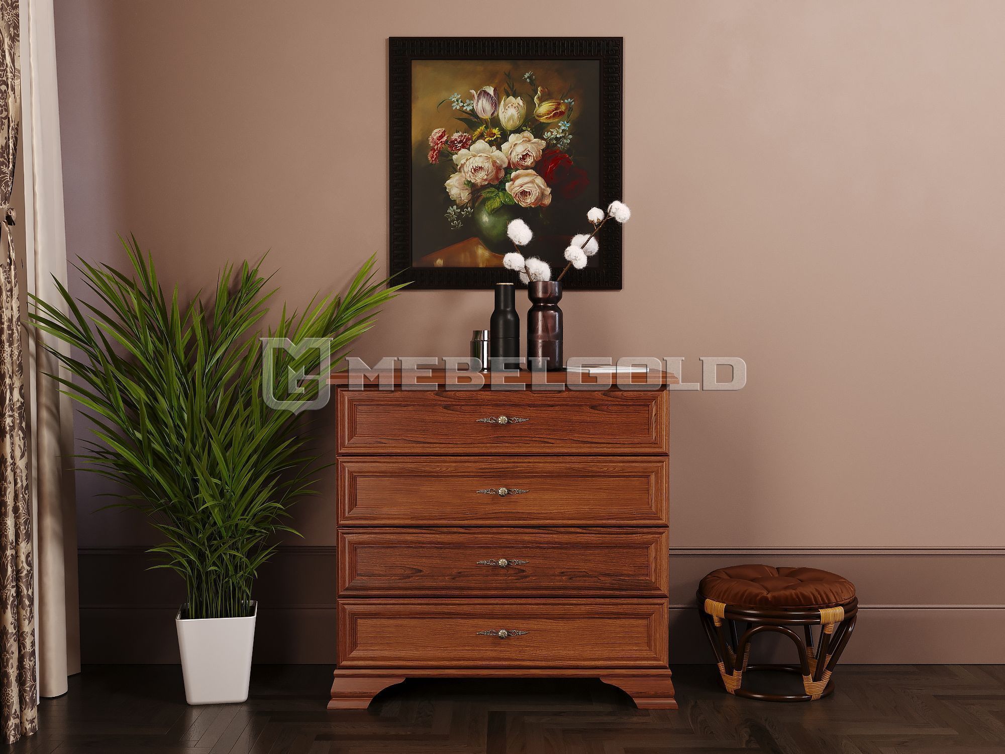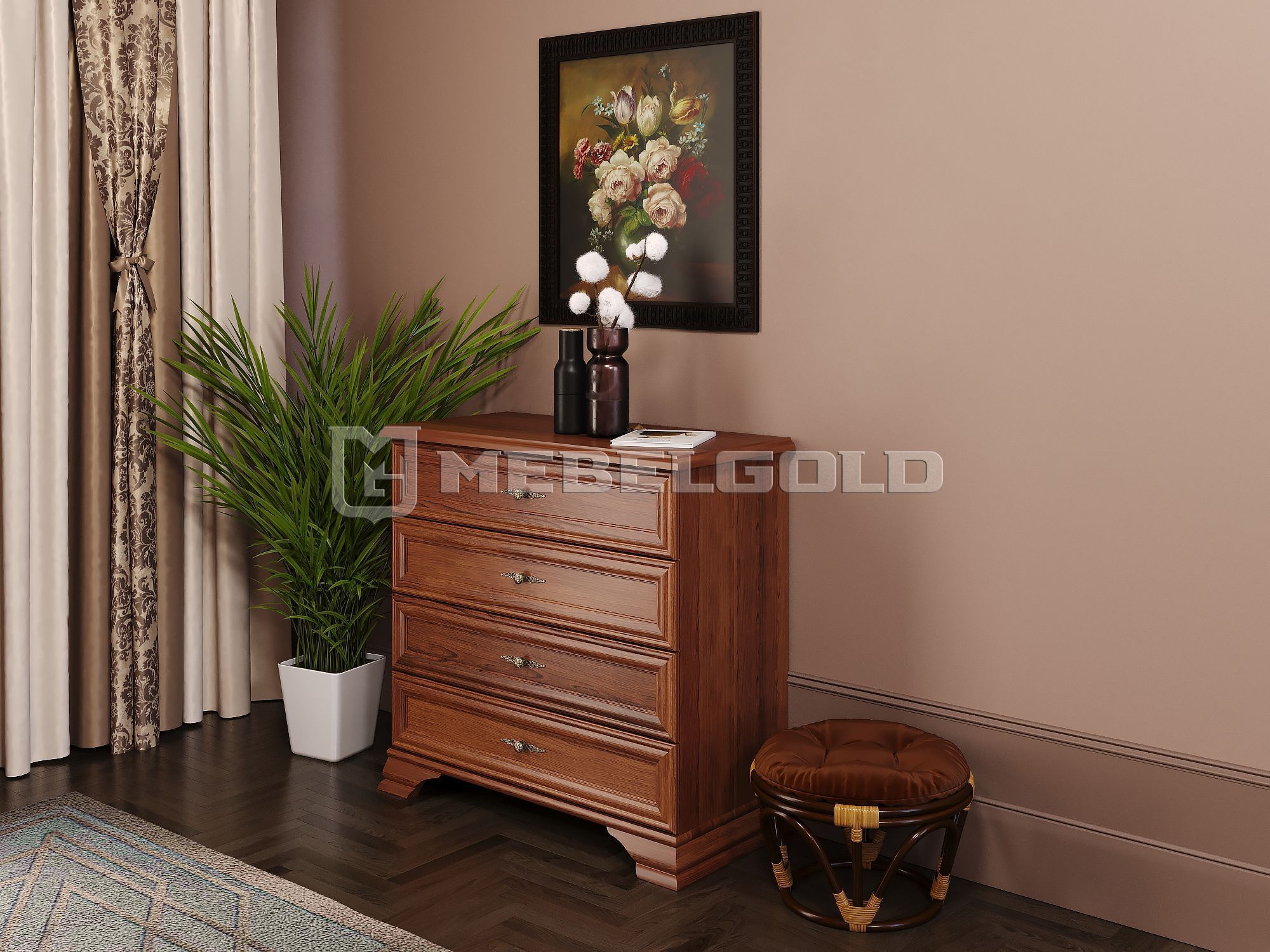 Комод коллекции Kentaki имеет широкие, устойчивые резные ножки и 4 ящика одинакового размера. В качестве декора и функционального элемента использована элегантная металлическая фурнитура. За счет высоты 90 см, ширины 94,5 см, глубины 44,5 см он вместит большой объем вещей и не загромоздит пространство.