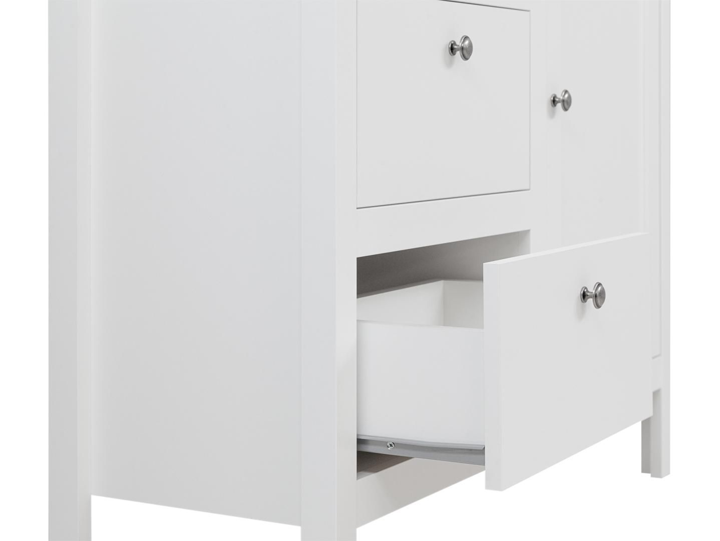 Напольная белая тумба серии Ewa (Helga) изготовлена в Белоруссии из надежных и недорогих материалов ЛДСП, МДФ, не уступающих в прочности натуральному дереву. Это сравнительно небольшая конструкция высотой 98 и шириной 96 см. С ее правой стороны расположены 3 ящика, слева находится распашная дверца и 2 полки внутри.