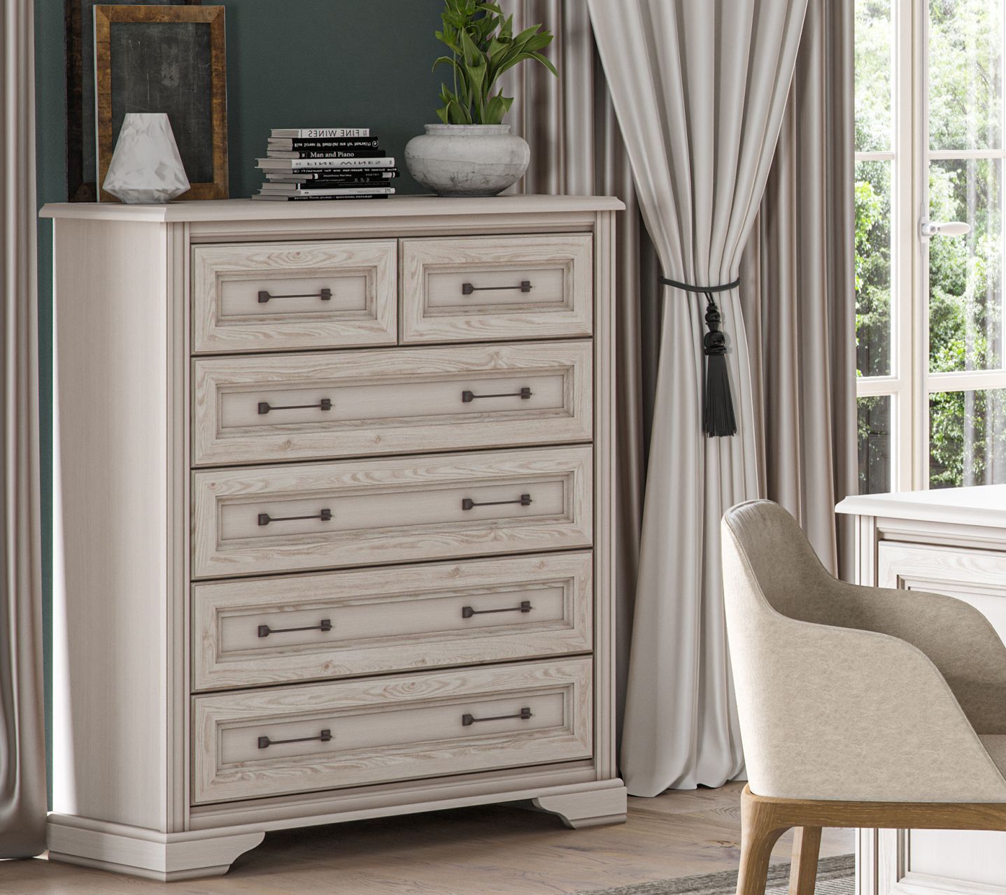 Фасады комода Stylius имеют красивый древесный рисунок с бороздками темного оттенка и красивый цвет сибирской лиственницы. При любом освещении такие поры смотрятся естественно и богато. Эта модель с резным карнизом, рифлеными ножками и филенками станет уместным решением для классических и неоклассических интерьеров. Ее поверхность можно использовать для хранения книг и ночника, ящики – для белья, игрушек и документов. Подберите к комоду другую мебель из этой коллекции, в комплекте он смотрится просто шикарно!