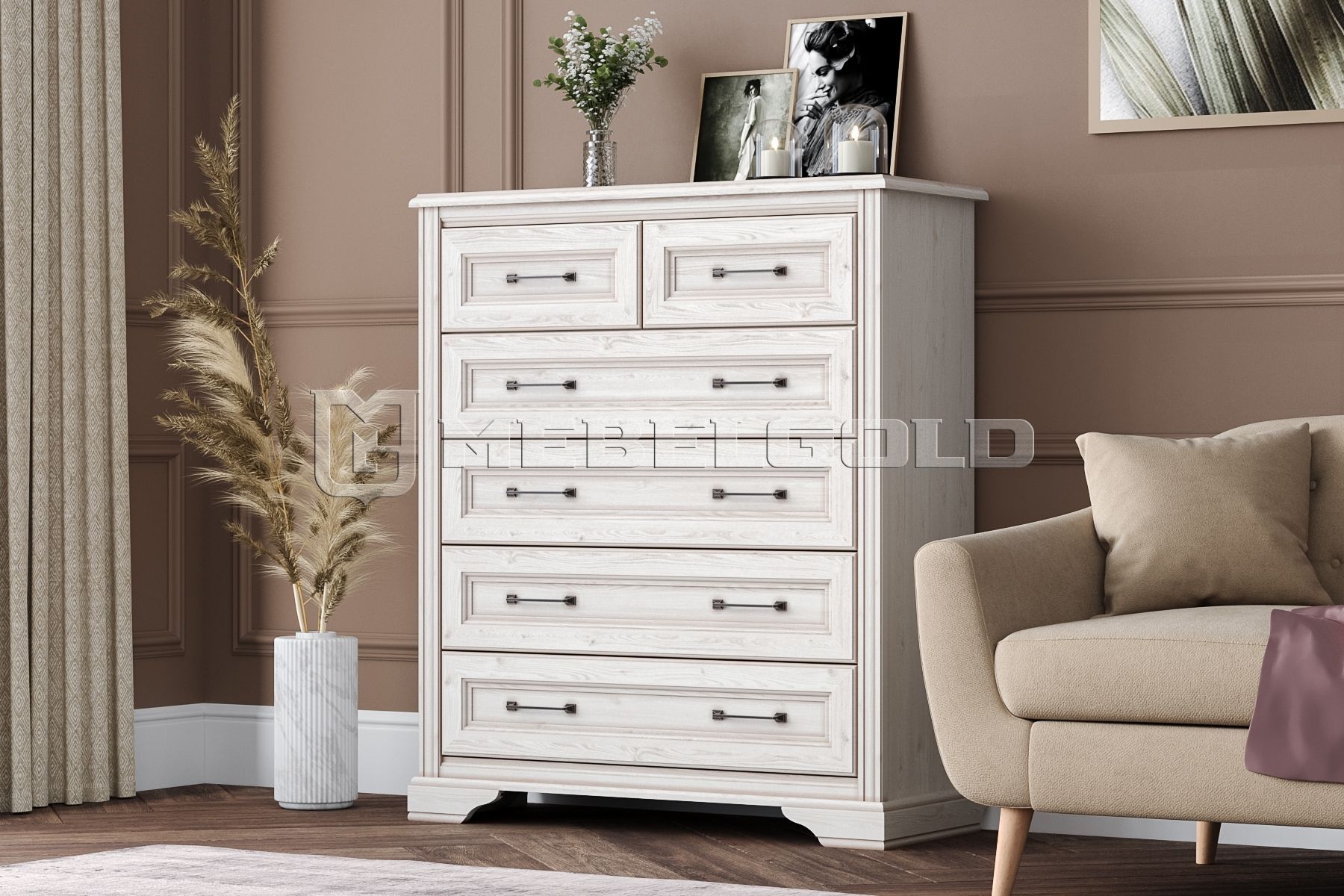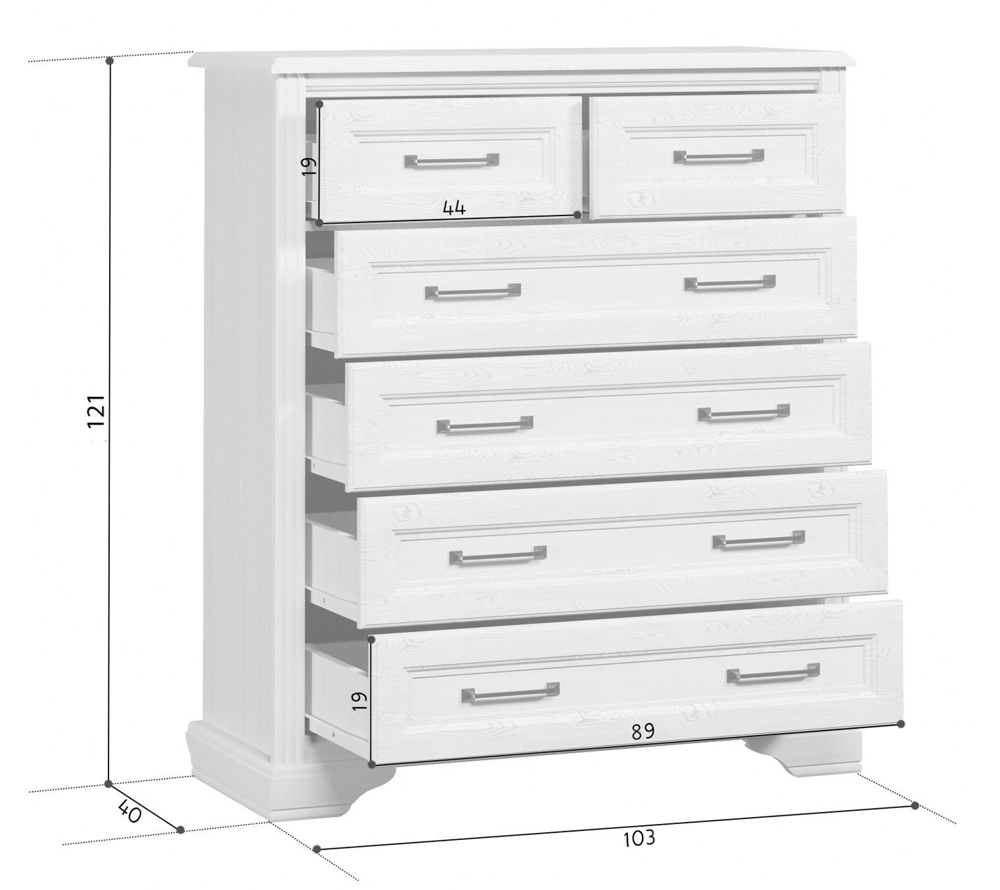 Комод Stylius высотой 121 см и шириной 103 см впишется в пространство небольшой гостиной, спальни, детской и кабинета. Он укомплектован шестью выдвижными ящиками на шариковых направляющих. Их нижняя часть укреплена металлическими профилями от провисания. Для защиты от опрокидывания производитель укомплектовал заднюю стенку специальной страховочной лентой.