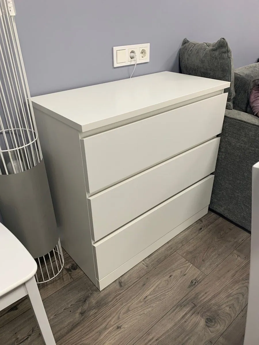 Комод Варма 3, 803х400х775, цвет Белый. Стильный удобный комод с тремя выдвижными ящиками. Прекрасно дополнит интерьер и теплую уютную домашнюю атмосферу. Хорошие параметры функциональности (качественные телескопические направляющие, вместительность, удобство использования). Поверхность окрашена экологически безопасными материалами, продолжительное время сохраняет внешний вид. Отлично сочетается в интерьере со стеллажами и полками Фора, журнальными столиками и ТВ-тумбами Энкель, стеллажами Варма. Доступен к заказу не только в белом цвете, но и с покрытием натуральным шпоном (беленый дуб, черный). Преимущества: эстетичный внешний вид; вместительность; простая сборка; экологичность и высокое качество окраски (экологически безопасные материалы); высококачественные телескопические направляющие (мягкое открывание). Крепежные элементы (дюбель-гвозди) приобретаются Покупателем дополнительно в зависимости от материала стены. Гарантийный срок для жилых и общественных помещений 24 месяца.