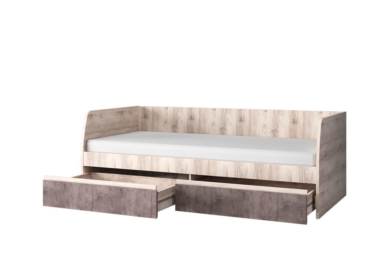 Кровать JAZZ 90-2 из ЛДДСП производителя Anrex оснащена двумя широкими выдвижными ящиками. Сюда можно уложить постельные принадлежности, игрушки и все, что должно быть спрятано от посторонних глаз. Сплошное фанерное основание марки МК создает жесткую и надежную опору для спины, предупреждает прогибание и провисание.