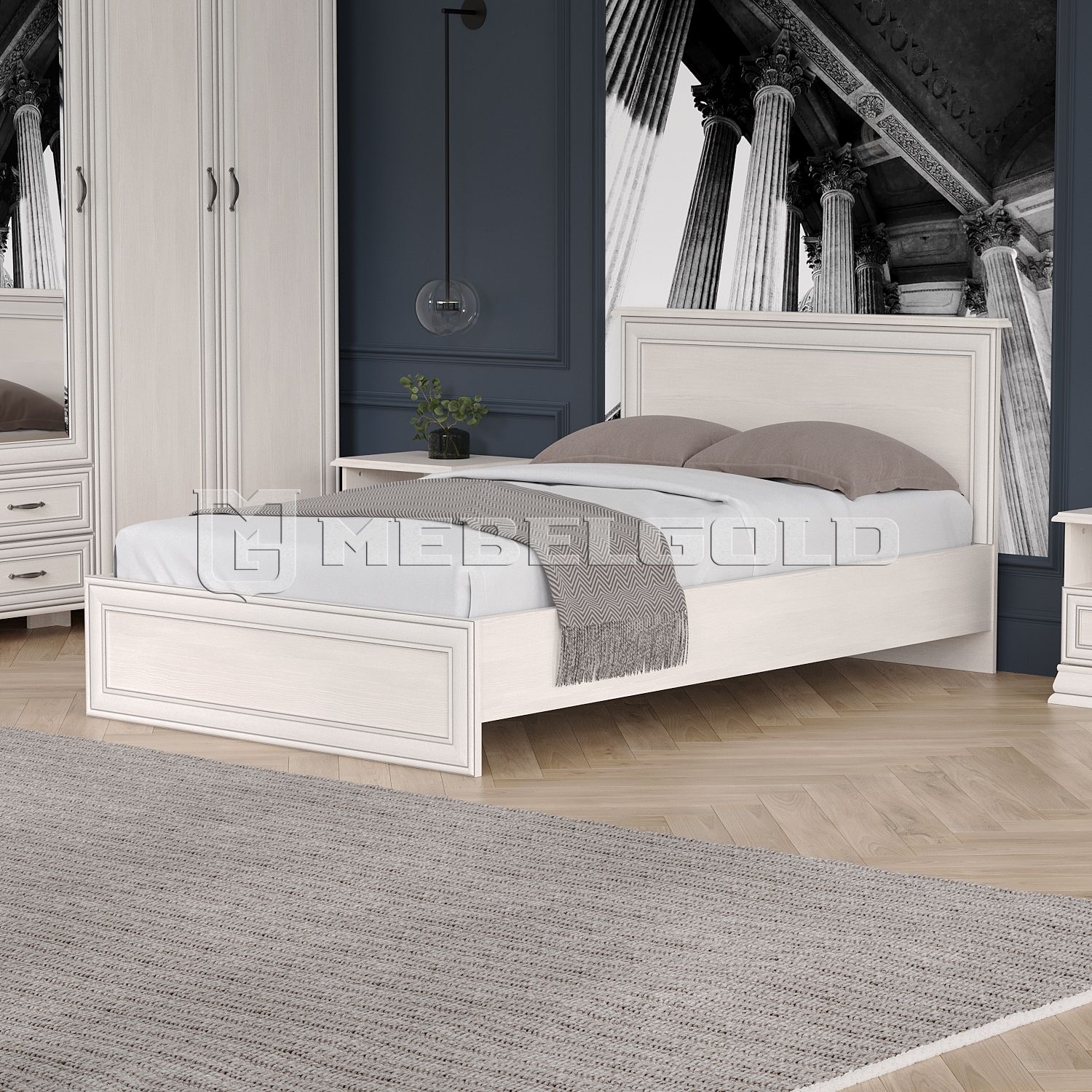 Белорусская кровать Tiffany 120 Anrex имеет низкое изножье и высокую спинку, придающую конструкции благородный вид. По их поверхности проходят патинированные планки, а поверхность имеет приятный светлый оттенок вудлайн кремовый. Царги имеют равномерно гладкое покрытие с аналогичным древесным рисунком с продольными узорами. Светлые фасады наполняют комнату светом и создают позитивную атмосферу.