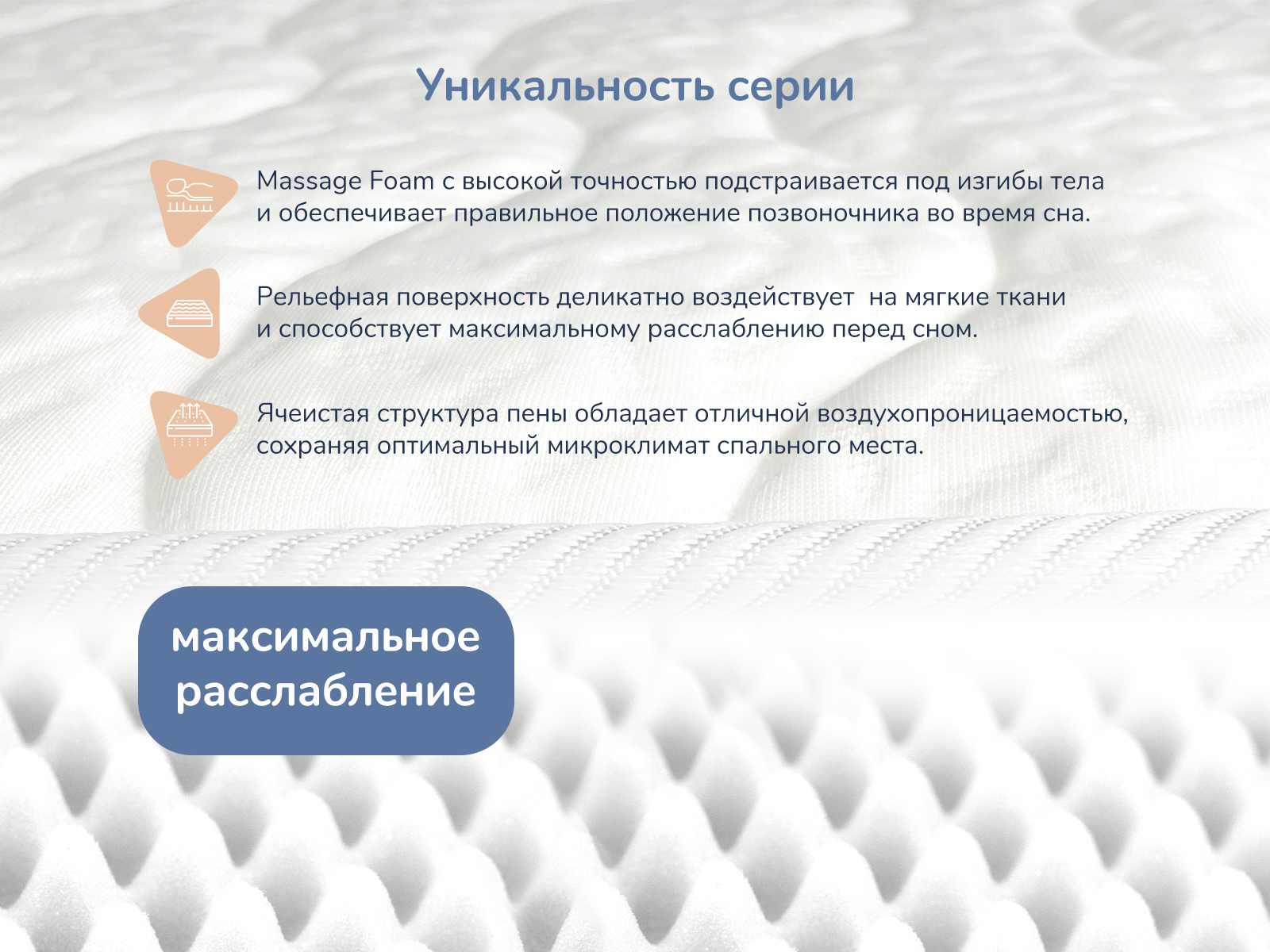 Практичный материал ячеистой структуры обеспечивает беспрепятственное прохождение воздуха, сохраняя гигиеничность и чистоту спального места. Рельефная поверхность обладает массажным эффектом и гарантирует высокую степень комфорта. Massage foam точечно подстраивается под изгибы тела, обеспечивая правильное положение позвоночника во время сна. Для более эффективного массажа слой пены вшит в чехол.