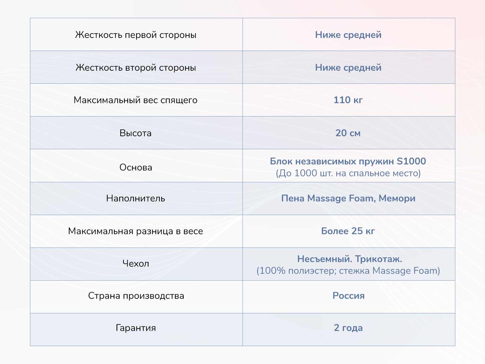 Спальные стороны модели проложены технологичной пеной мемори, которая передаёт постели эффект памяти формы. Материал делает пластичные слепки фигуры, а затем медленно возвращается в ровное состояние, как только нагрузка снимается. По уровню подстройки – это один из самых анатомичных наполнителей.