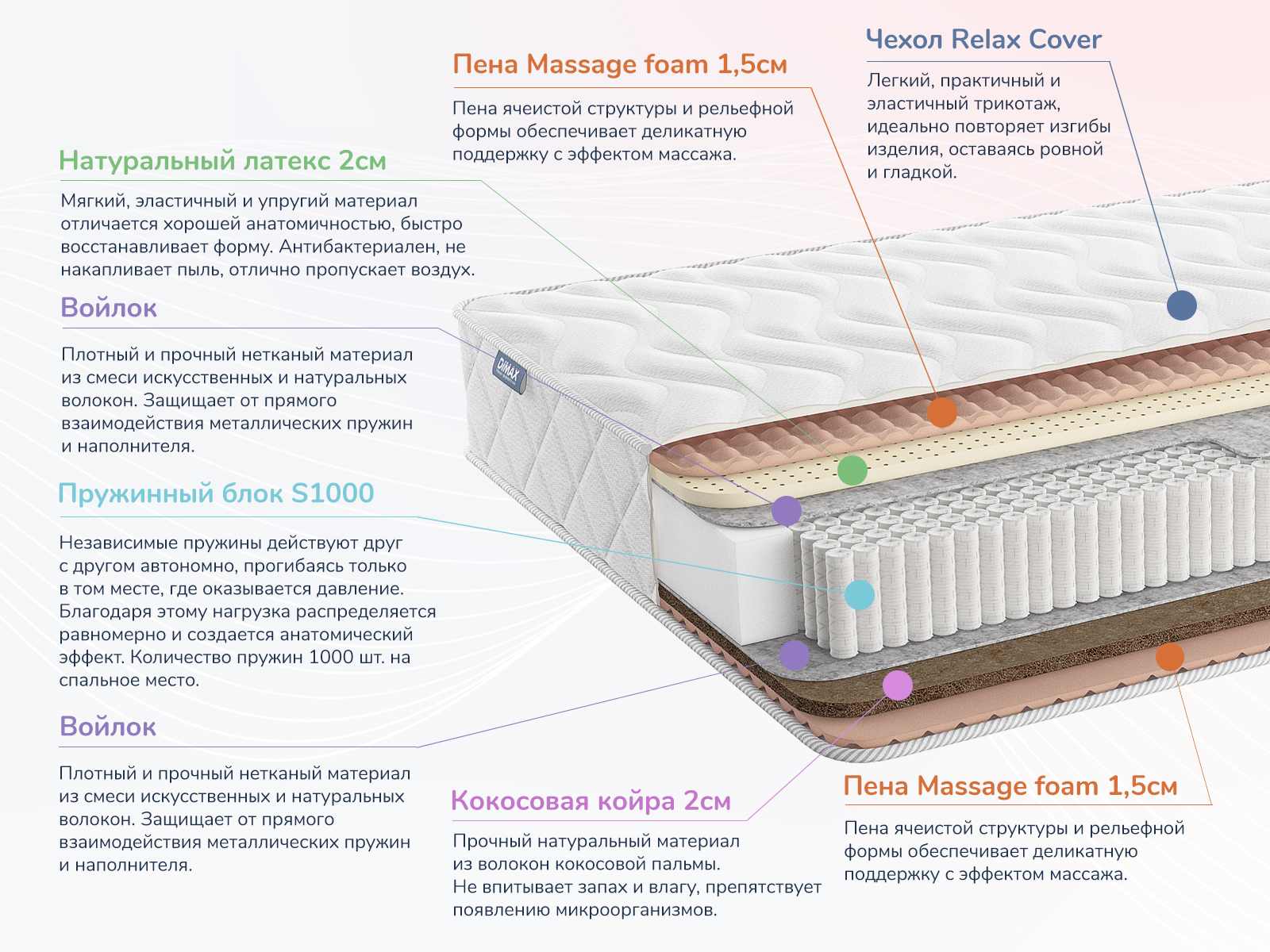 Практичный материал ячеистой структуры обеспечивает беспрепятственное прохождение воздуха, сохраняя гигиеничность и чистоту спального места. Рельефная поверхность обладает массажным эффектом и гарантирует высокую степень комфорта. Massage foam точечно подстраивается под изгибы тела, обеспечивая правильное положение позвоночника во время сна. Для более эффективного массажа слой пены вшит в чехол.