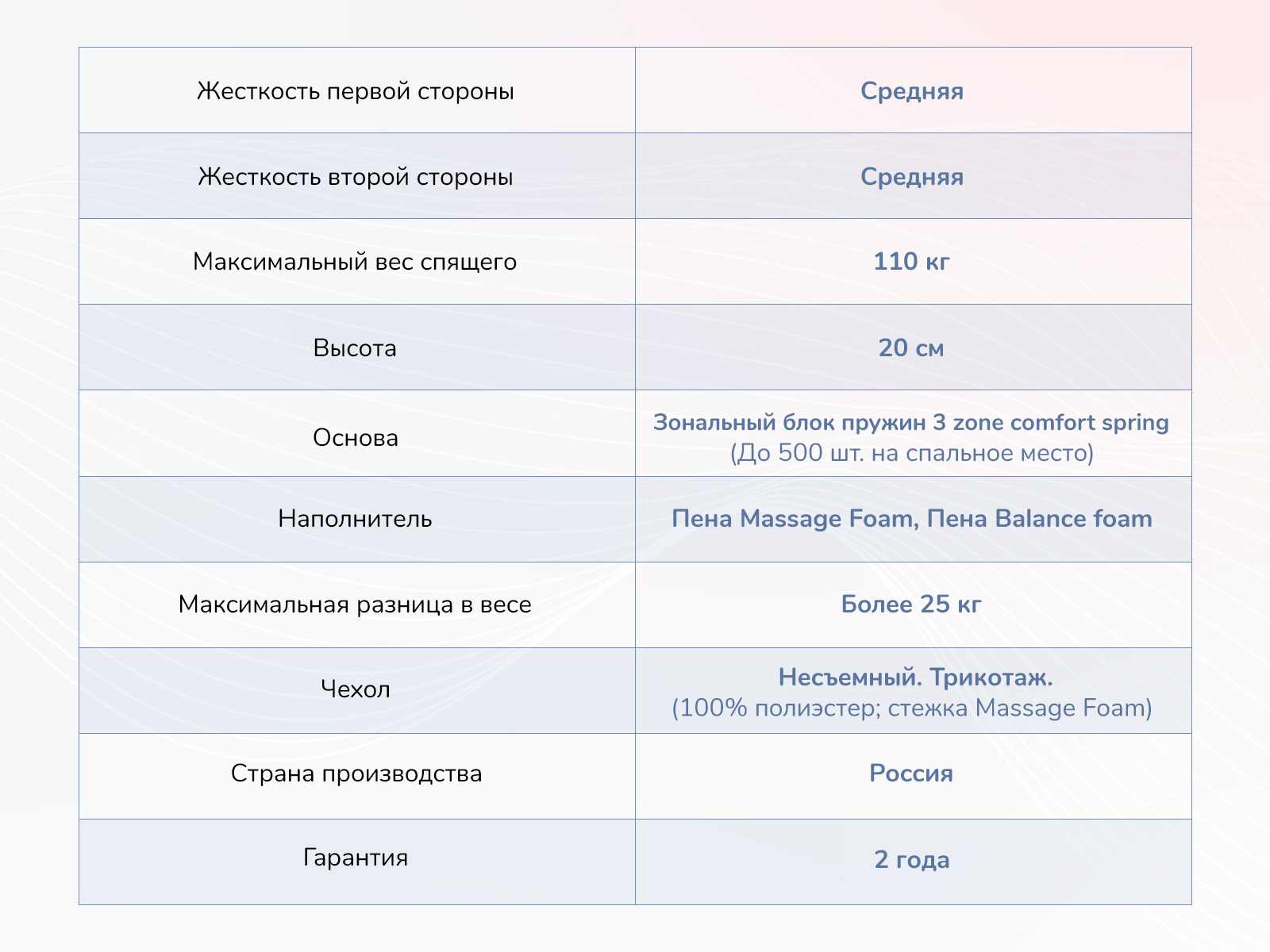 В качестве основы матраса установлен блок 3 level comfort zone. Система имеет три уровня поддержки: плечи, бёдра и ноги. Каждая зона обладает своим особым уровнем жёсткости, оптимальным для той или иной части тела.
