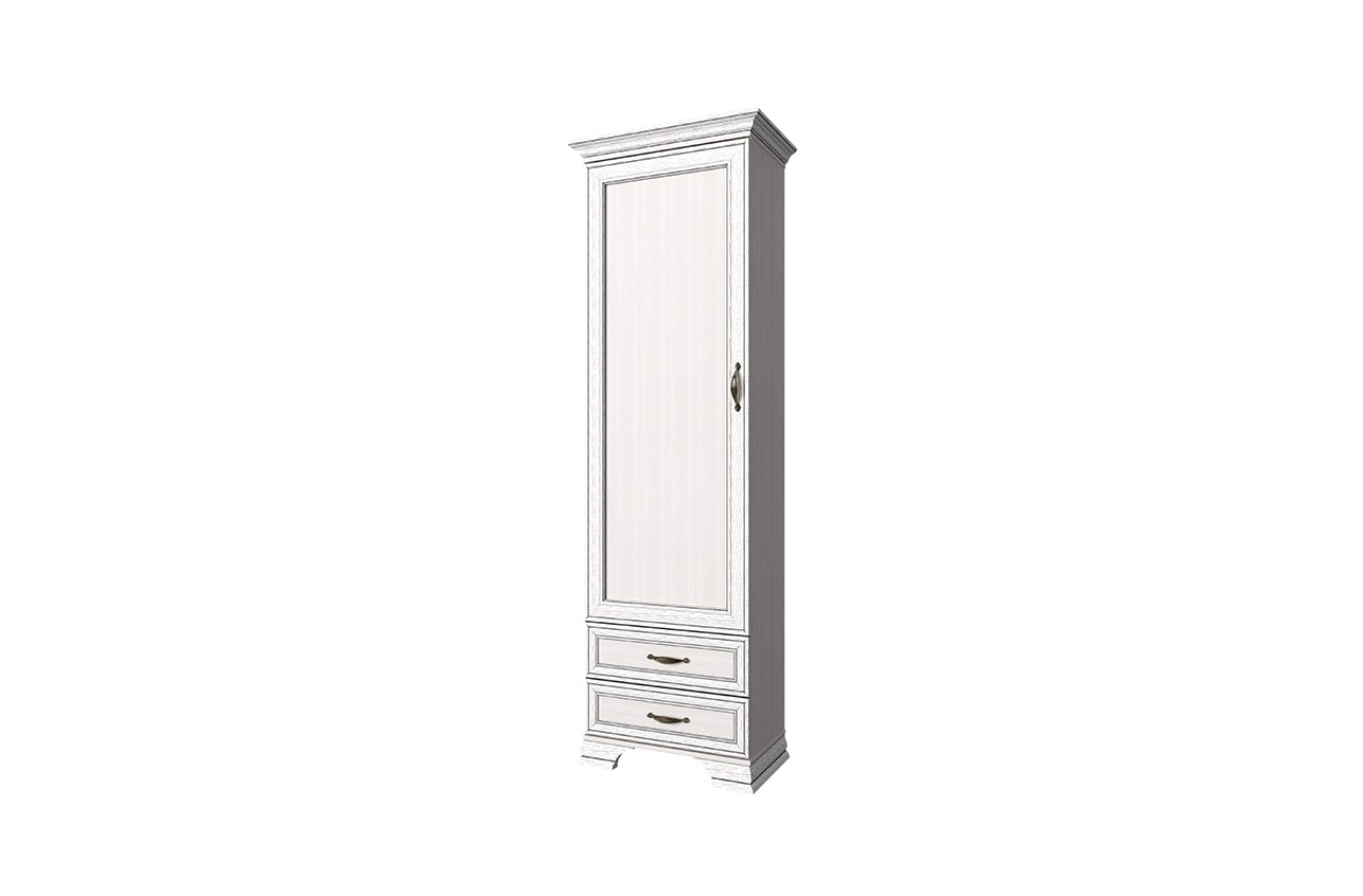 Узкий шкаф с глухой дверью Tiffany представлен эксклюзивной моделью 1D2S белорусского бренда Anrex. Этот компактный пенал по максимуму использует высоту 212 см и ширину 69 см. Его основу составляет каркас, одна распашная дверь и два выдвижных ящика. По верху проходит декоративный карниз, фасады имеют рамочно-филенчатую конструкцию, а само покрытие точно передает эффект состаренности.