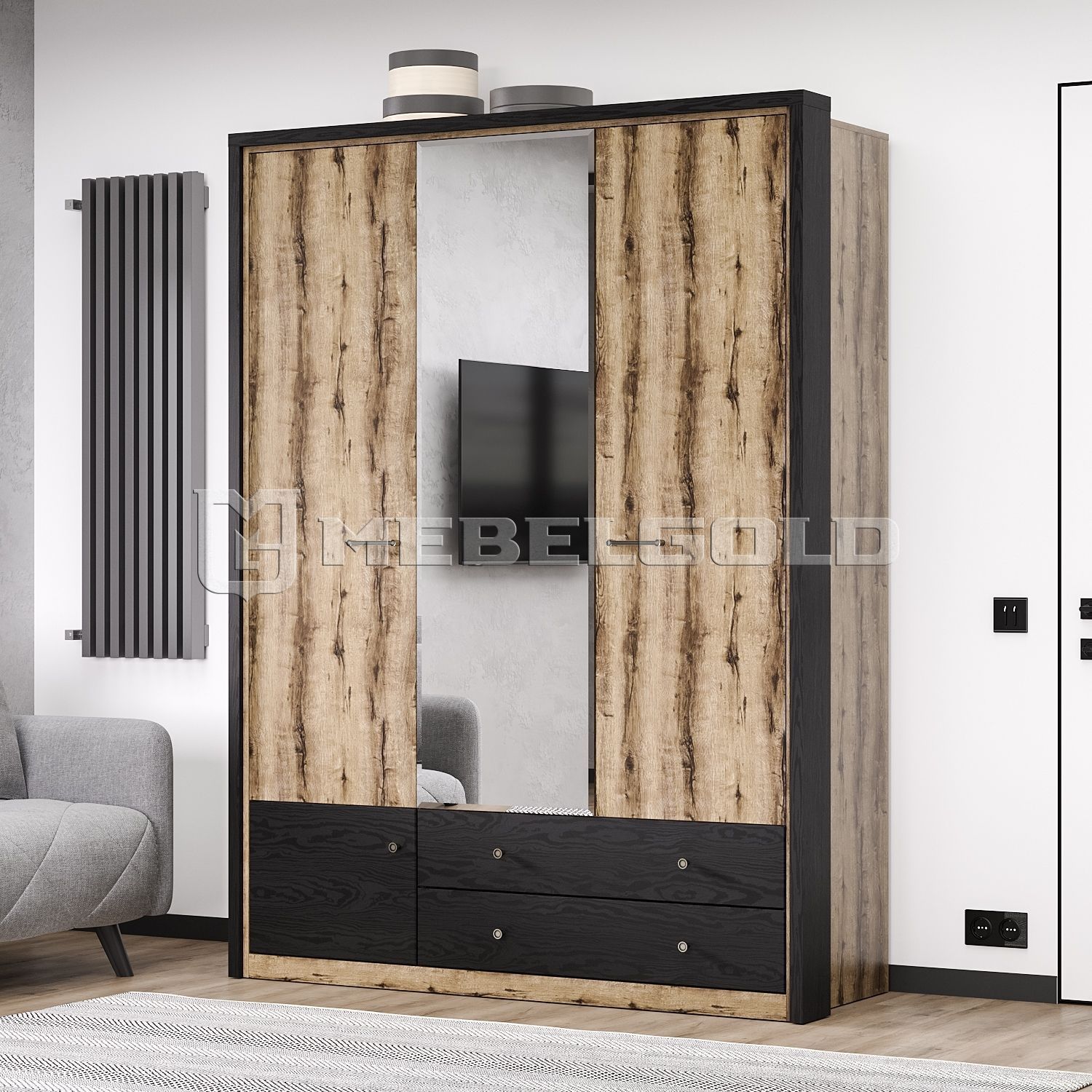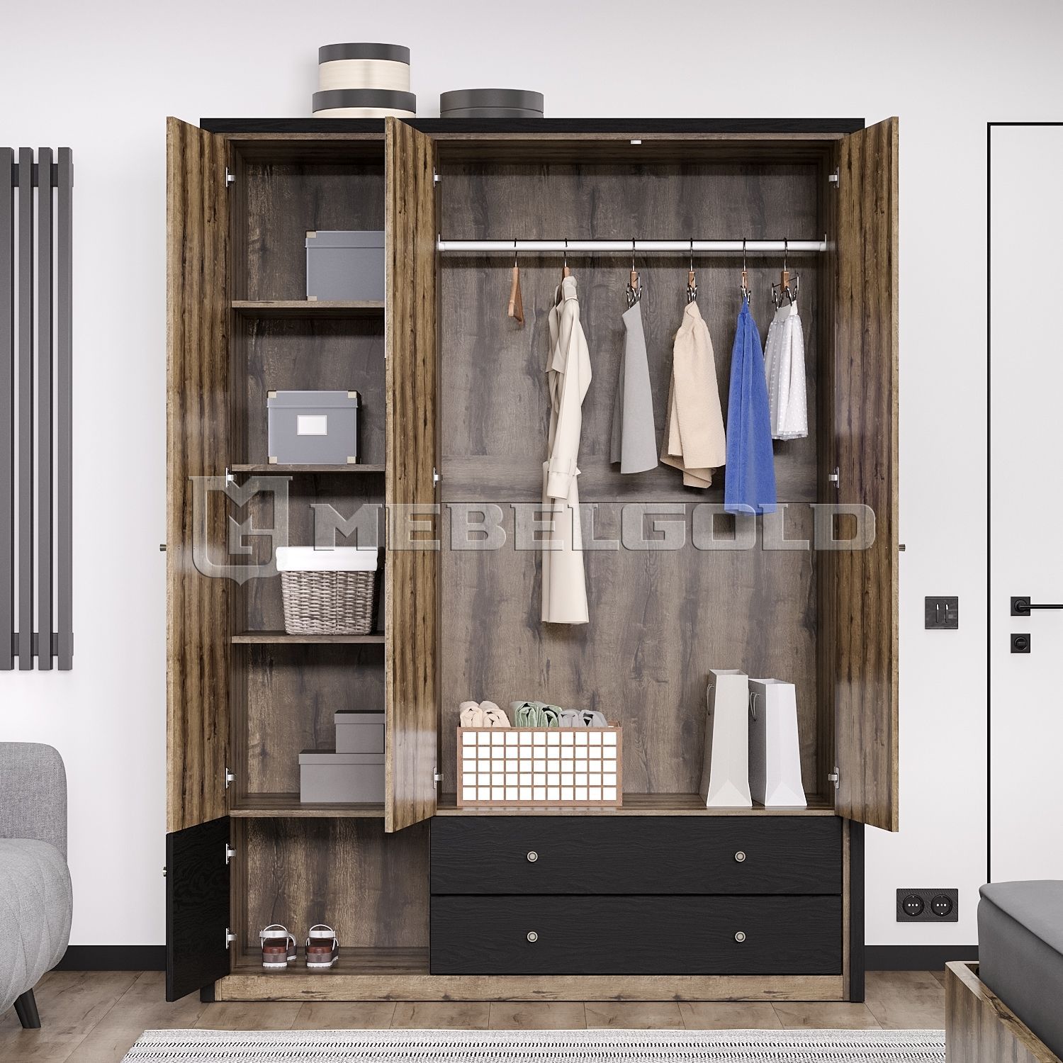 При изготовлении трехстворчатого шкафа Jagger белорусский производитель Anrex польскую фурнитуру GTV и GAMET. Яркий и самобытный, представленный в темной цветовой гамме, он уместно смотрится в обстановке спальни. Более эффектно он выглядит вместе с другой мебелью из коллекции «Джаггер».