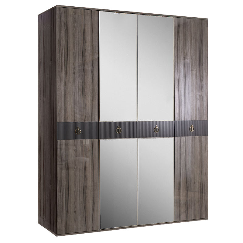 Ширина четырехстворчатого шкафа с зеркалами Rimini Solo составляет 181 см, а глубина – 60 см. На таких условиях здесь можно хранить как мелкие вещи типа трикотажных маек, так и крупную сезонную одежду. Ее дизайн лишен вычурностей и сложного декора. Его заменяют элегантные планки под золото/серебро, фрезерованные вставки по центру и модные оттенки фасада. Прямые линии такой мебели и незамысловатый, но элегантный декор позволяет использовать ее в гостиных, спальнях и кабинетах.