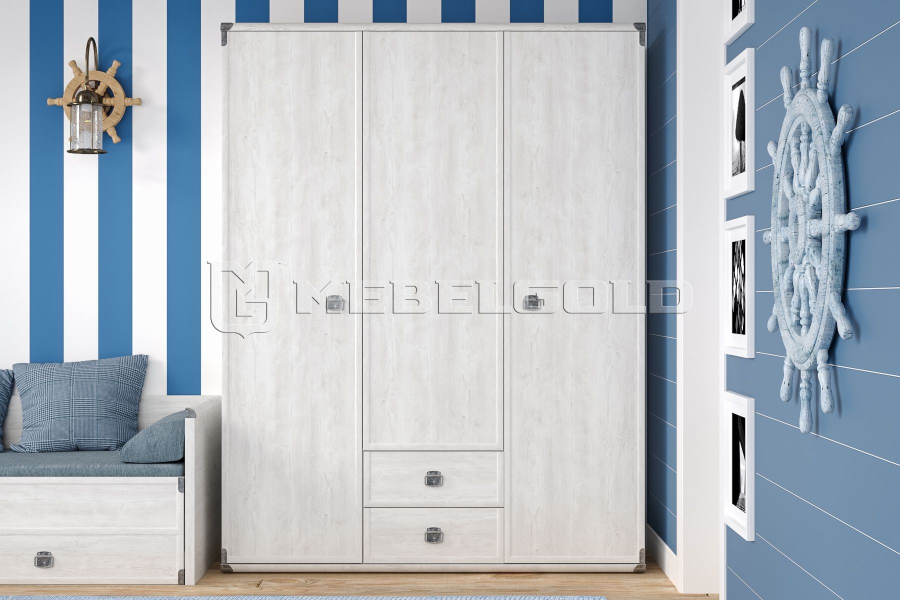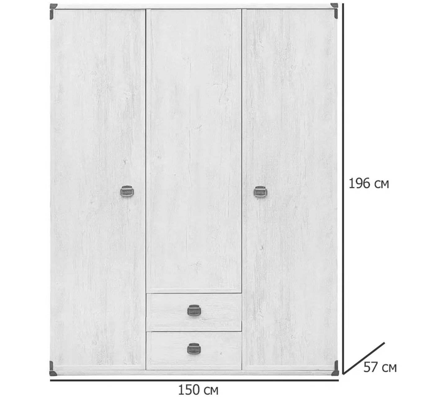 Распашной шкаф «Индиана» имеет высоту 195 см и ширину 150 см. При глубине 57 см он уместит одежду на плечиках и позволит хранить ее в расправленном виде. Эта модель изготовлена в заводских условиях из недорогого, но прочного материала ЛДСП. По поверхности фасадов проходит планка из МДФ. Оригинальные ручки-подковы и металлические уголки придают ей стильный вид и позволяют с уверенностью использовать в классических и кантри интерьерах.