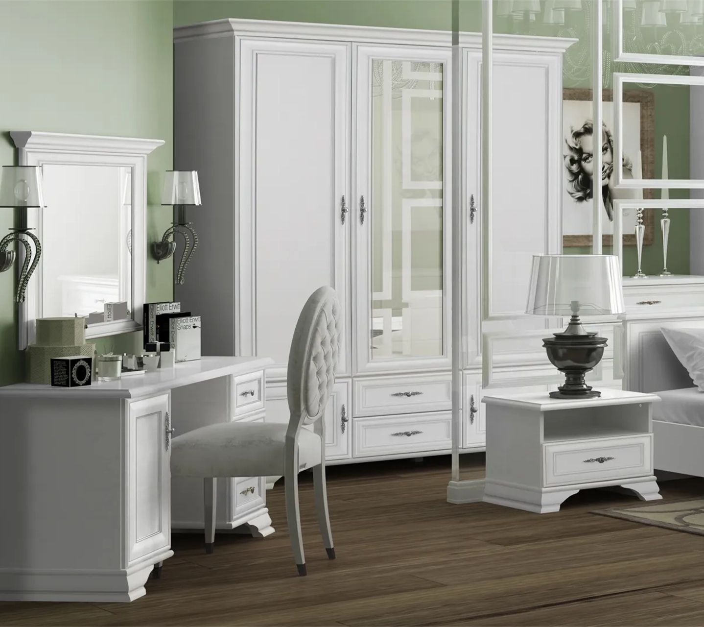 Признанным эталоном качества шкафа с зеркалом Kentaki является использование немецкой и итальянской фурнитуры. Его ящики плавно движутся по металлическим направляющим, а витиеватые ручки под бронзу наиболее отчетливо смотрятся на белом фоне. Шкаф на резных ножках с декоративным карнизом – яркое наследие классики. Такая мебель прекрасно смотрится и в лаконичных скандинавских интерьерах, контрастной неоклассике и современных направлениях типа модерн и минимализм.