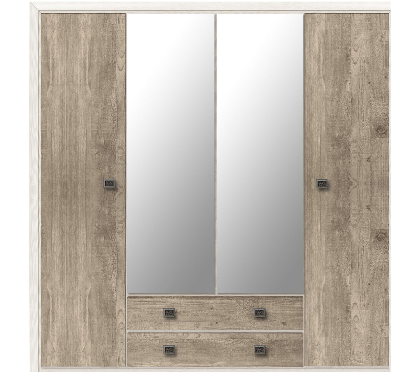 Четырехдверный шкаф Koen SZF4D2S укомплектован двумя зеркалами и ящиками. Эта конструкция два в одном сделана из ЛДСП и украшена декоративной МДФ рамкой. Наклеенная на поверхность ламинированная пленка защищает мебель от размокания и в точности передает фактуру снежного ясеня и легкий коричневый оттенок натуральной сосны.