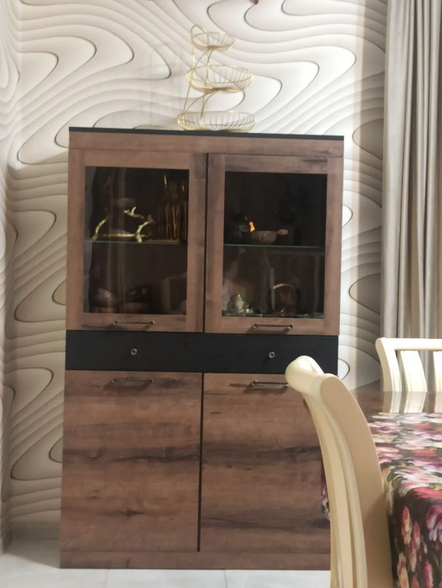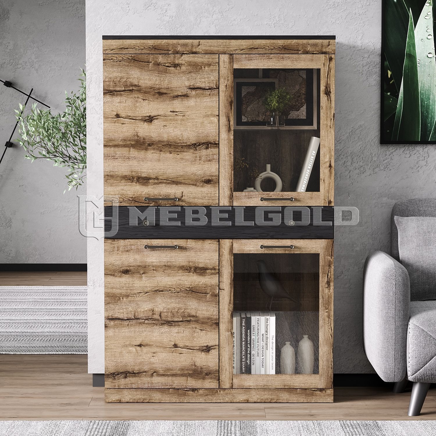 В этой модели сочетаются сразу два предмета интерьера – шкаф и витрина. Она гармонично совмещает закрытые отделения со стеклянными фасадами и выполняет сразу несколько функций. Он помогает хранить вещи за глухими дверцами и самые красивые предметы выставлять на общий обзор.