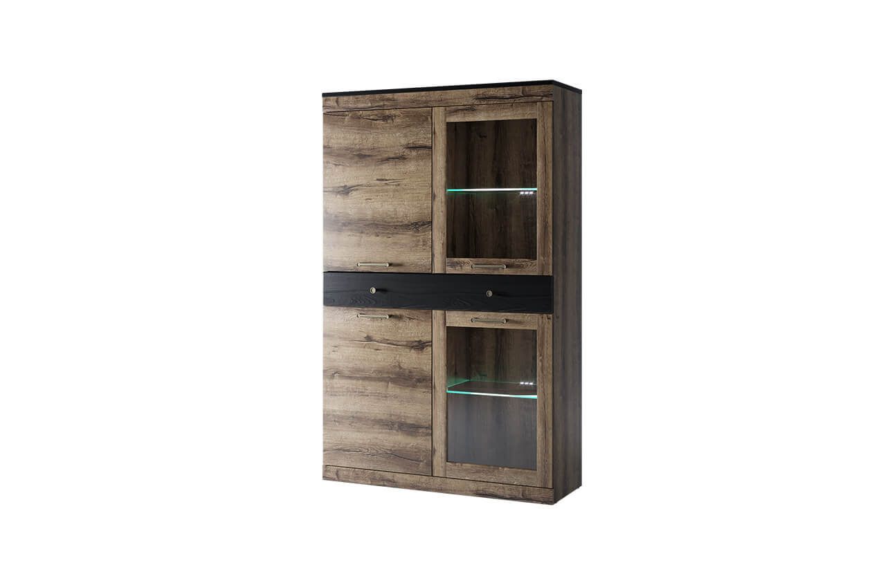 В центре шкафа с витриной Jagger установлен черный выдвижной ящик с круглыми металлическими ручками, что придает ему выразительность и стильный вид. Такую мебель можно с уверенностью устанавливать в комнатах, оформленных в стиле модерн, минимализм и хай-тек. Дверцы легко перевешиваются на левую или правую сторону, а при необходимости – дополняются LED подсветкой. Шкаф с витриной «Джаггер» является вместительной моделью с шириной 100 см, высотой 159 см и глубиной 35 см.