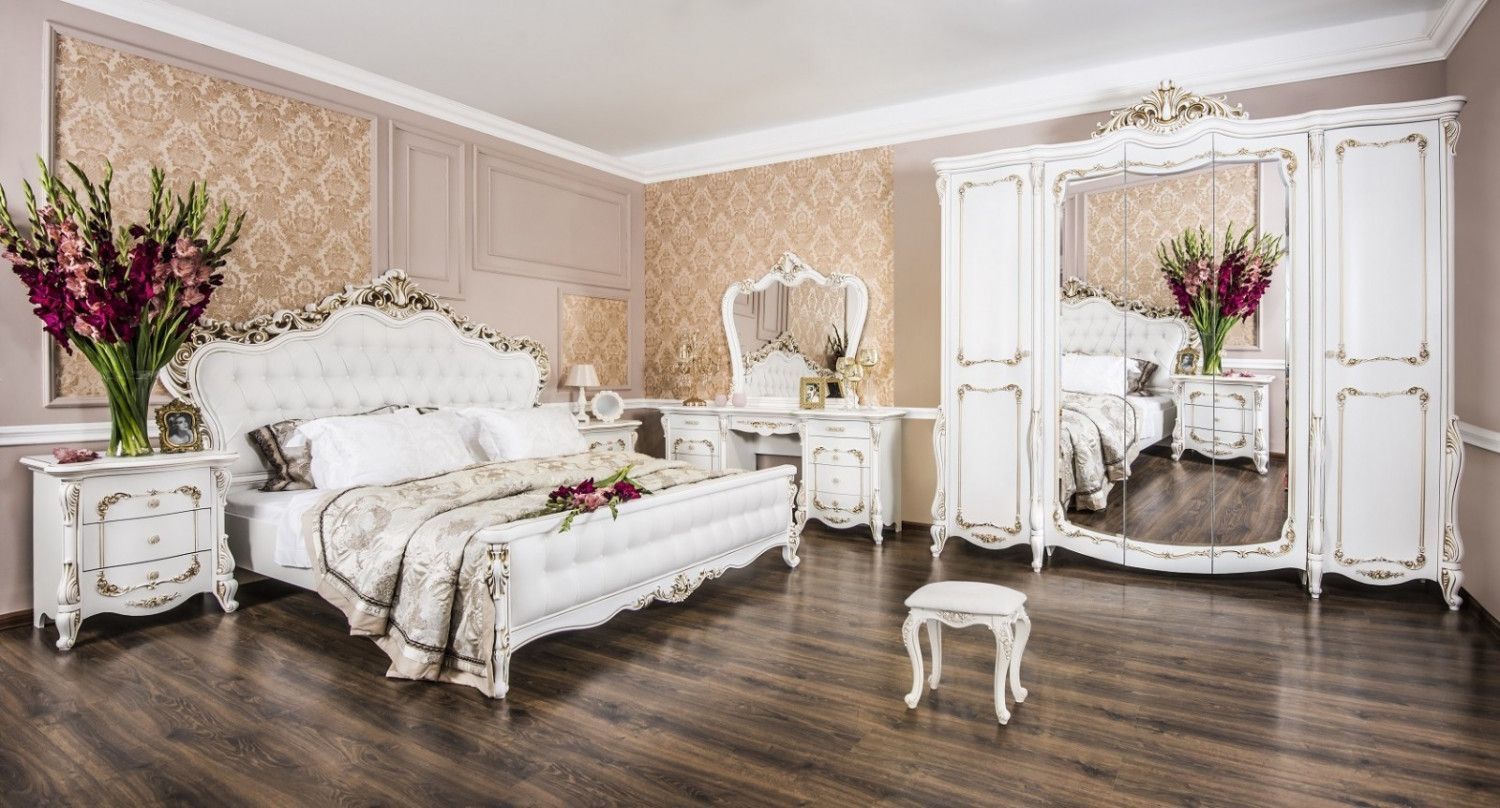 Прямые фасады изготовлены из МДФ с фрезеровкой, а для производства корпуса использовалась ЛДСП. Вычурная фурнитура, накладки, покрытые золотой патиной, качественная обивка и элегантный декор — каждый элемент в коллекции подчёркивает аристократичный вкус владельца.