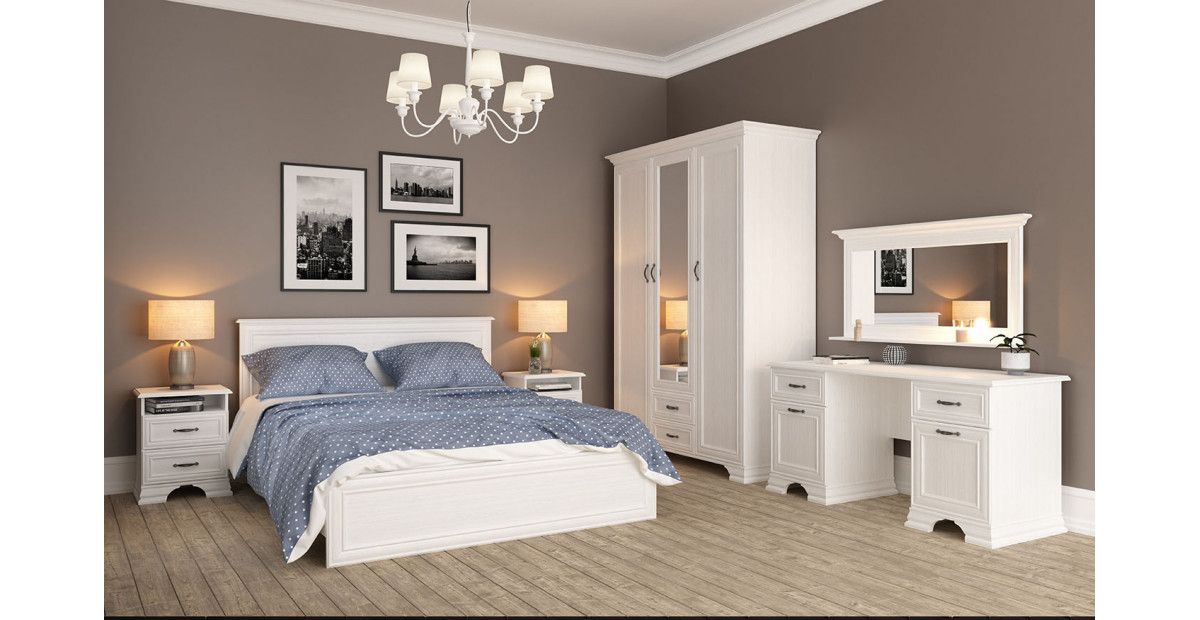 Спальня Юнона 2 от Мебель-Неман в классическом стиле с отделкой структурной фактуры, обрамленный рамочным фасадом, где металлические ручки выгодно подчёркивают стиль и изящество, всегда актуальна и востребована.