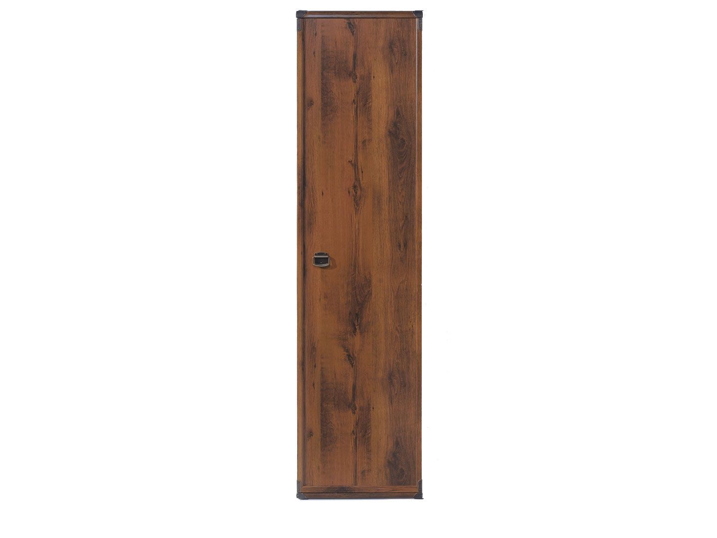 Высокий одностворчатый шкаф Indiana представлен в цвете дуб саттер. Его фасады насыщенного коричневого цвета дополнены металлическими накладками на углах и латунными ручками по типу подковы. Модель в такой отделке является приоритетным вариантом для классических интерьеров и комнат, оформленных в стиле кантри. Ее можно установить в детской, гостиной или домашней библиотеке. Мини-шкаф легко впишется в узкое пространство и эффективно решит поставленные задачи.