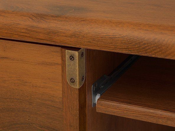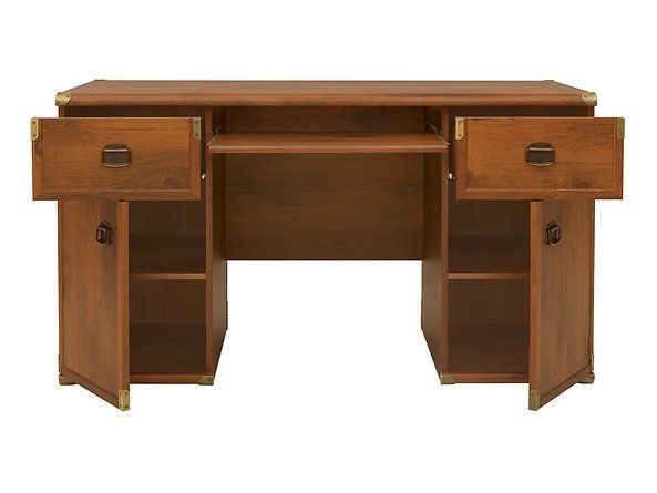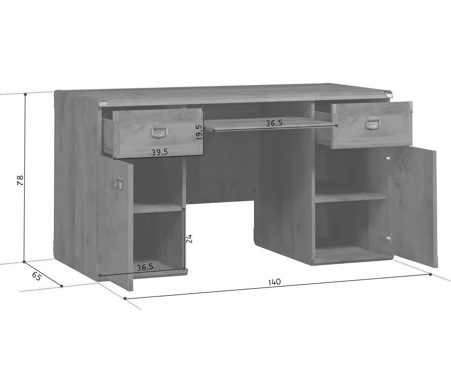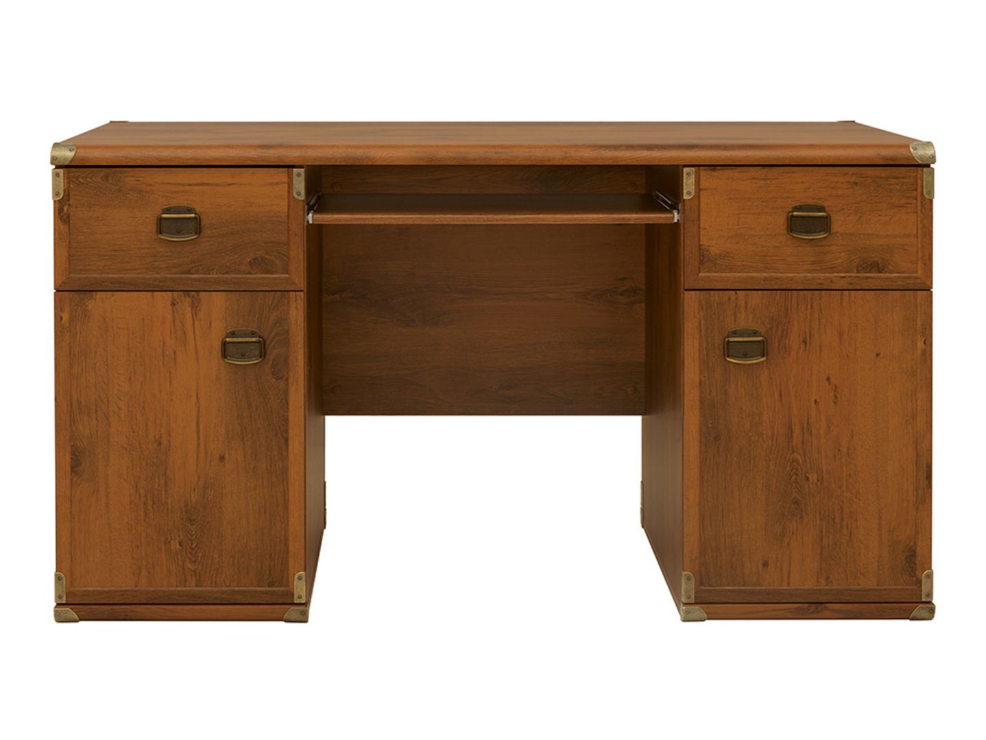 С обеих сторон письменного стола Indiana дуб саттер установлены тумбы с распашными дверцами и ящиками. Для комфортного пользования белорусский производитель BRW оснастил их роликовыми направляющими. Под столешницей располагается отсек под клавиатуру. Углы защищены металлическими накладками, которые одновременно являются и стильными элементами декора. Фасады имеют поверхность благородного, старого дуба с естественными прожилками древесины.