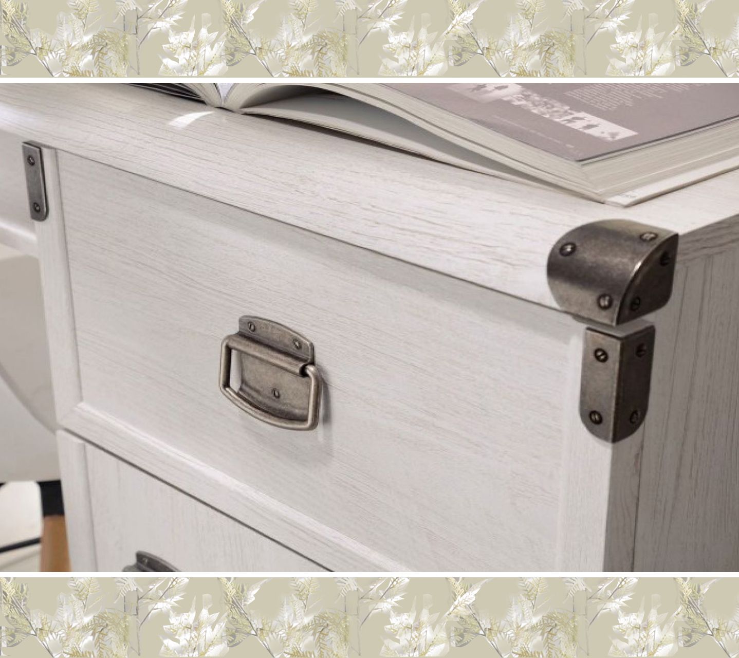 С обеих сторон письменного стола Indiana сосна каньон установлены тумбы с распашными дверцами и ящиками. Для комфортного пользования белорусский производитель BRW оснастил их роликовыми направляющими. Под столешницей располагается отсек под клавиатуру. Углы защищены металлическими накладками, которые одновременно являются и стильными элементами декора. Фасады имеют поверхность благородного, старого дуба с естественными прожилками древесины.