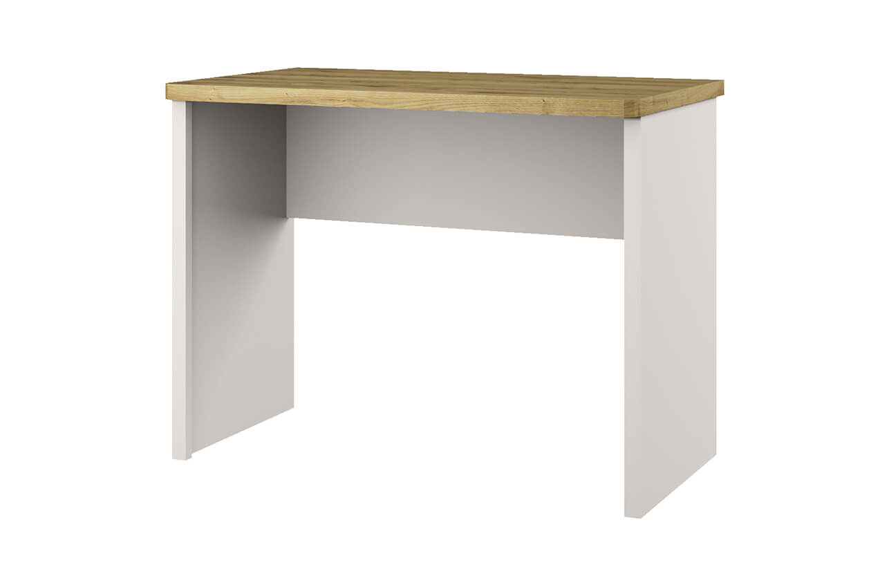Письменный стол белорусской коллекции Anrex Modern 100 представлен в минимальной комплектации. Он состоит из широких боковых опор и рабочей поверхности, оформленной в цвете дуба наварра. Она в точности воспроизводит текстуру натурального материала с его естественными вкраплениями, узорами и затемненными участками.