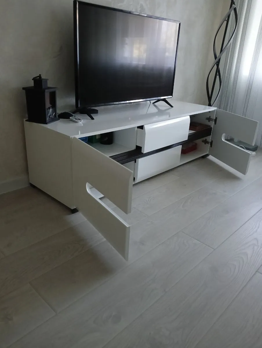 Белая тумба Azteca станет яркой доминантой интерьера и сделает комнату еще светлее. За счет универсального дизайна она легко впишется в любой тип помещения, а пластиковые ножки придадут ей дополнительную устойчивость и лаконичный вид. Тумбочка шириной 150 см подходит для установки телевизора любой диагонали, а также размещения аудиосистемы и предметов декора. Она визуально подчеркнет зону ТВ и обратит на себя внимание идеальной геометрией.