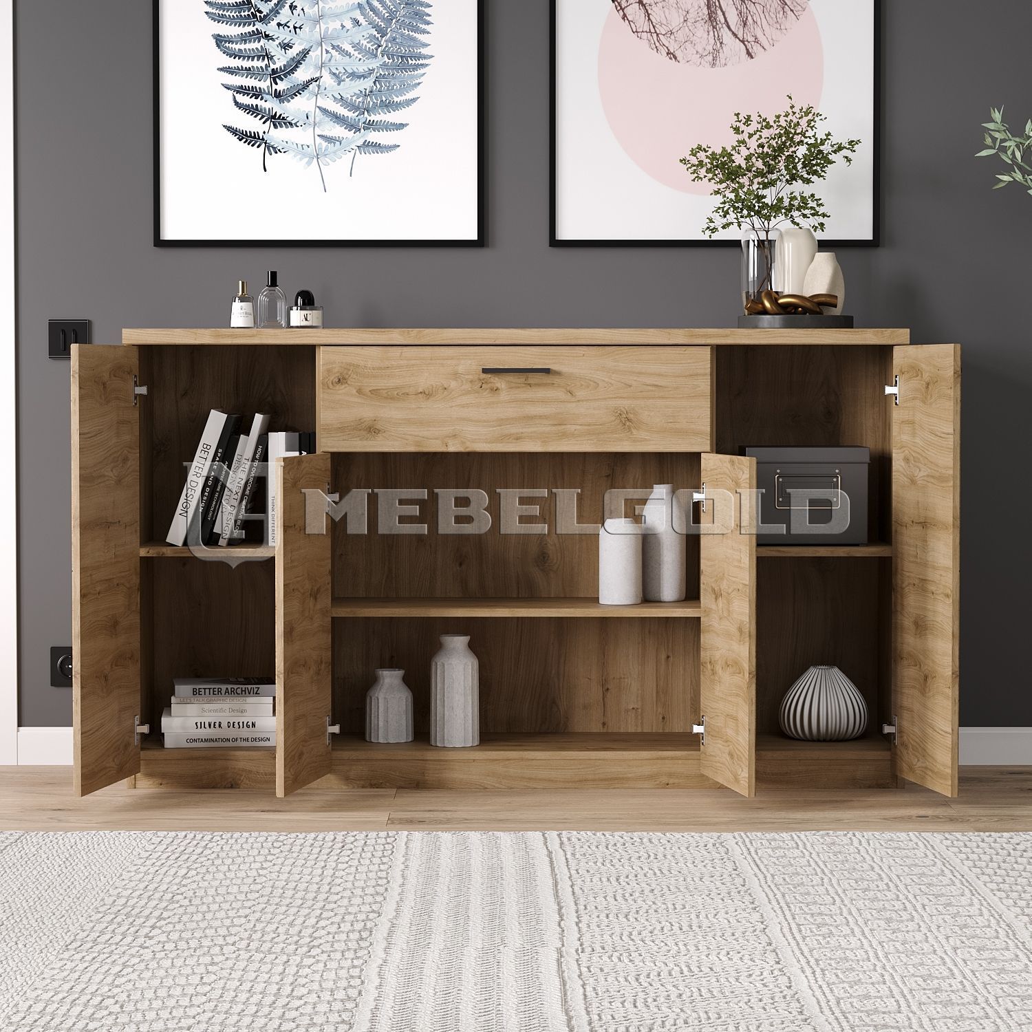 Тумба Doorset 4D1S шириной 160 и глубиной 41 см с легкостью заменит небольшой шкаф и уютно разместится вдоль стены. Своим простым, незамысловатым дизайном она не утяжелит интерьер и впишется в любое пространство. При изготовлении тумбочки используется ламинированная плита ДСП и МДФ в цвете дуб наварро. Такое покрытие легко очищается от загрязнений и не притягивает пыль.
