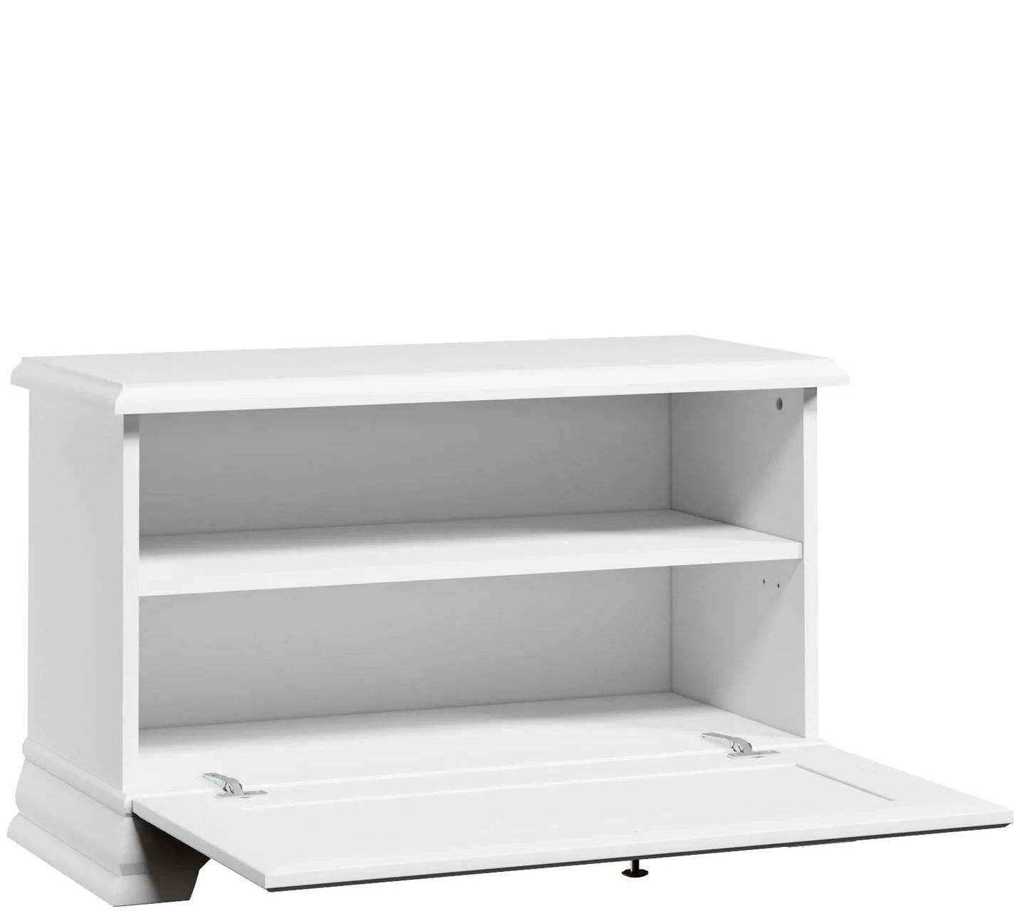 Белая тумба с закрытым фасадом спрячет от посторонних глаз кроссовки и сандалии, не позволит пыли и солнцу испортить их внешний вид. За счет широких ножек она приобретает устойчивость и стильное оформление. Тумба Kentaki с откидной дверцей и съемной полкой внутри уместит несколько пар сезонной и ежедневной обуви.
