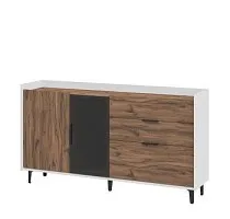 Тумба с тремя выдвижными ящиками; одной глухой распашной дверью и одной распашной витриной из алюминиевой рамки профилем 20х20мм, цвет: чёрный брашированный с тонированным стеклом; две стеклянные полки с тонированным стеклом бесшумными направляющими с доводчиком; петли плавного закрывания