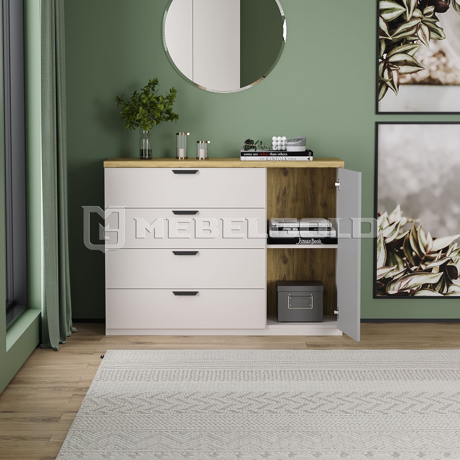Неотъемлемыми элементами тумбы Modern 1D4S являются серые металлические ручки SCHWINN в форме раковины. Эта удобная для захвата фурнитура придаст мебели стильный вид и упростит процесс открывания/закрывания. Тумба «Модерн» подойдет для спальни, прихожей и гостиной. Она везде найдет применение и поможет на высшем уровне организовать быт.