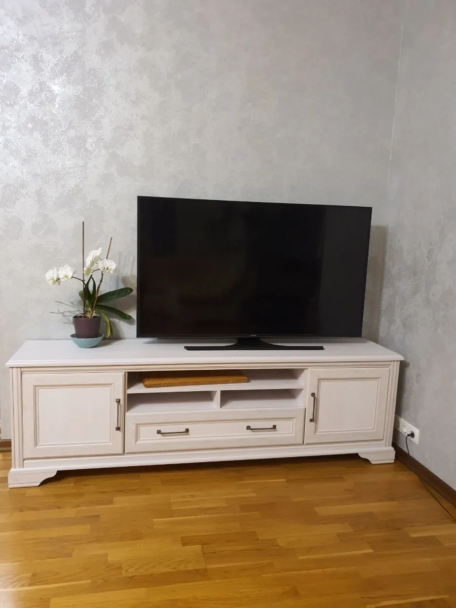 Дверцы и ящики свободно двигаются благодаря качественной фурнитуре из Европы. По своим функциям эта конструкция больше напоминает комод. На нее можно не только установить ТВ, но и хранить внутри диски, фотографии, документы. Закрытые полки надежно защитят предметы от пыли, проникновения влаги и помогут навести элементарный порядок.