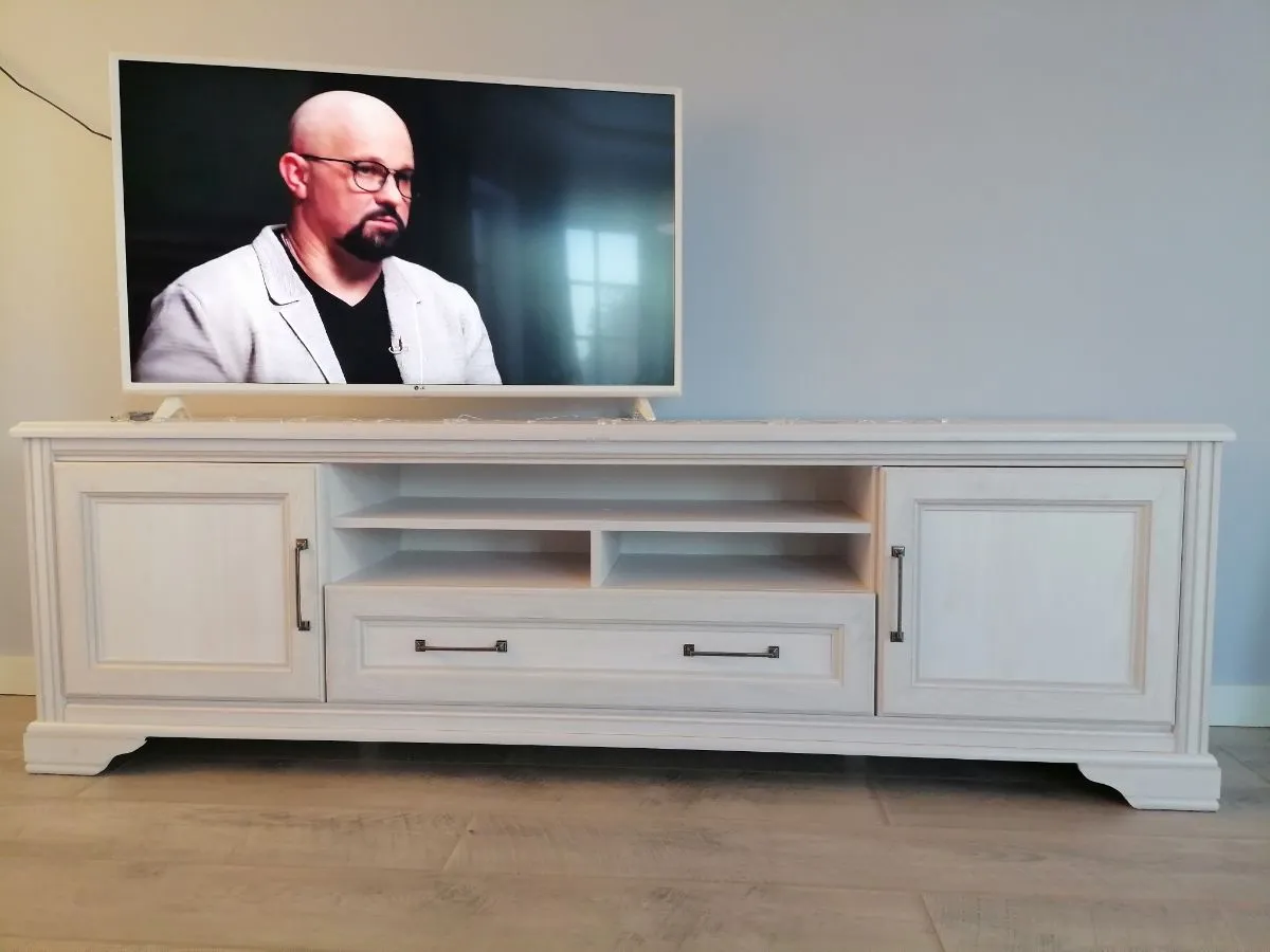 Напольная тумба под телевизор Stylius стилизована под дерево и имеет оттенок сибирской лиственницы с элементами патинирования. В таком дизайне она гармонично вписывается в интерьеры классического и неоклассического стиля. Это лучшее решение для залов, спален и столовых. Широкая тумбочка хорошо гармонирует с настенными полками и шкафами линейки «Стилиус».