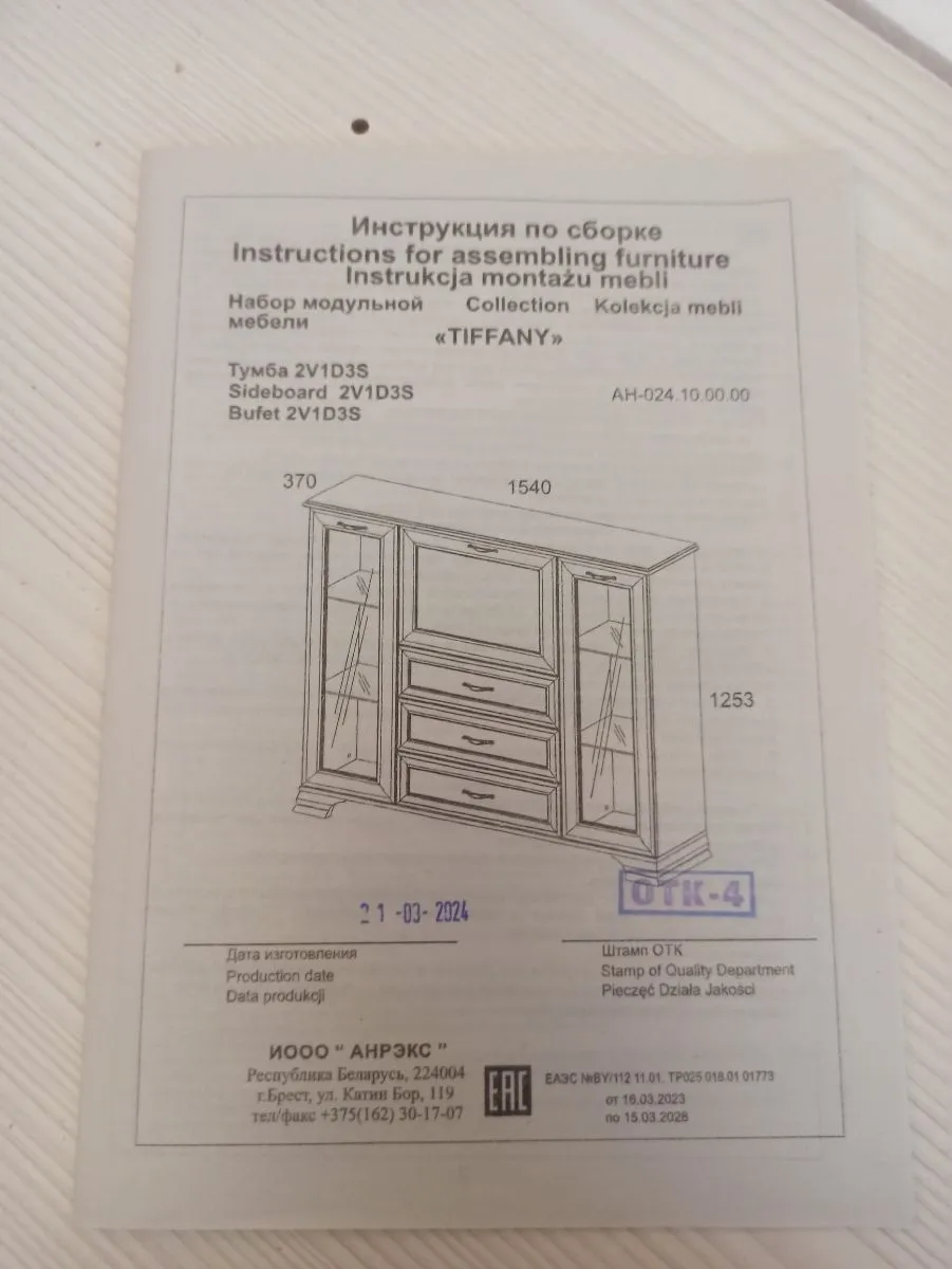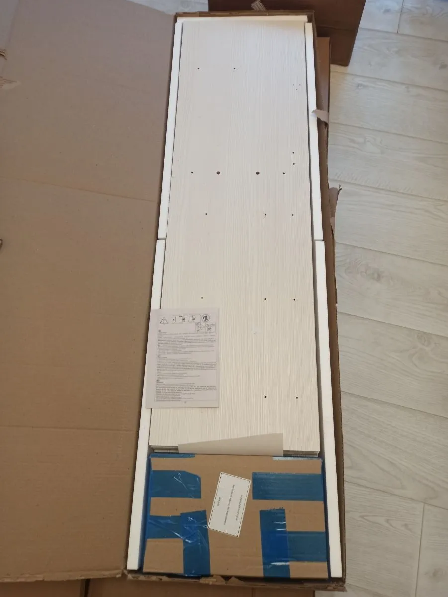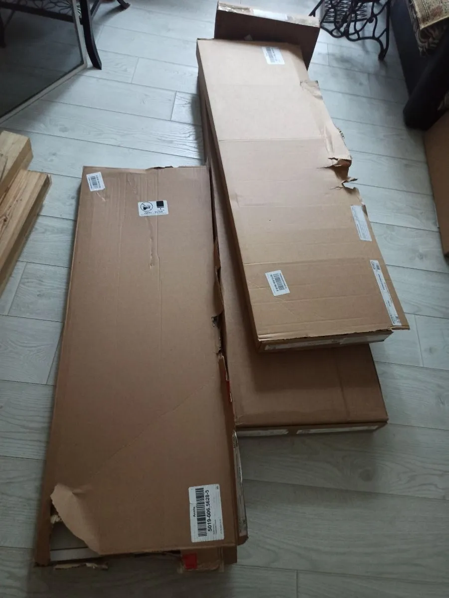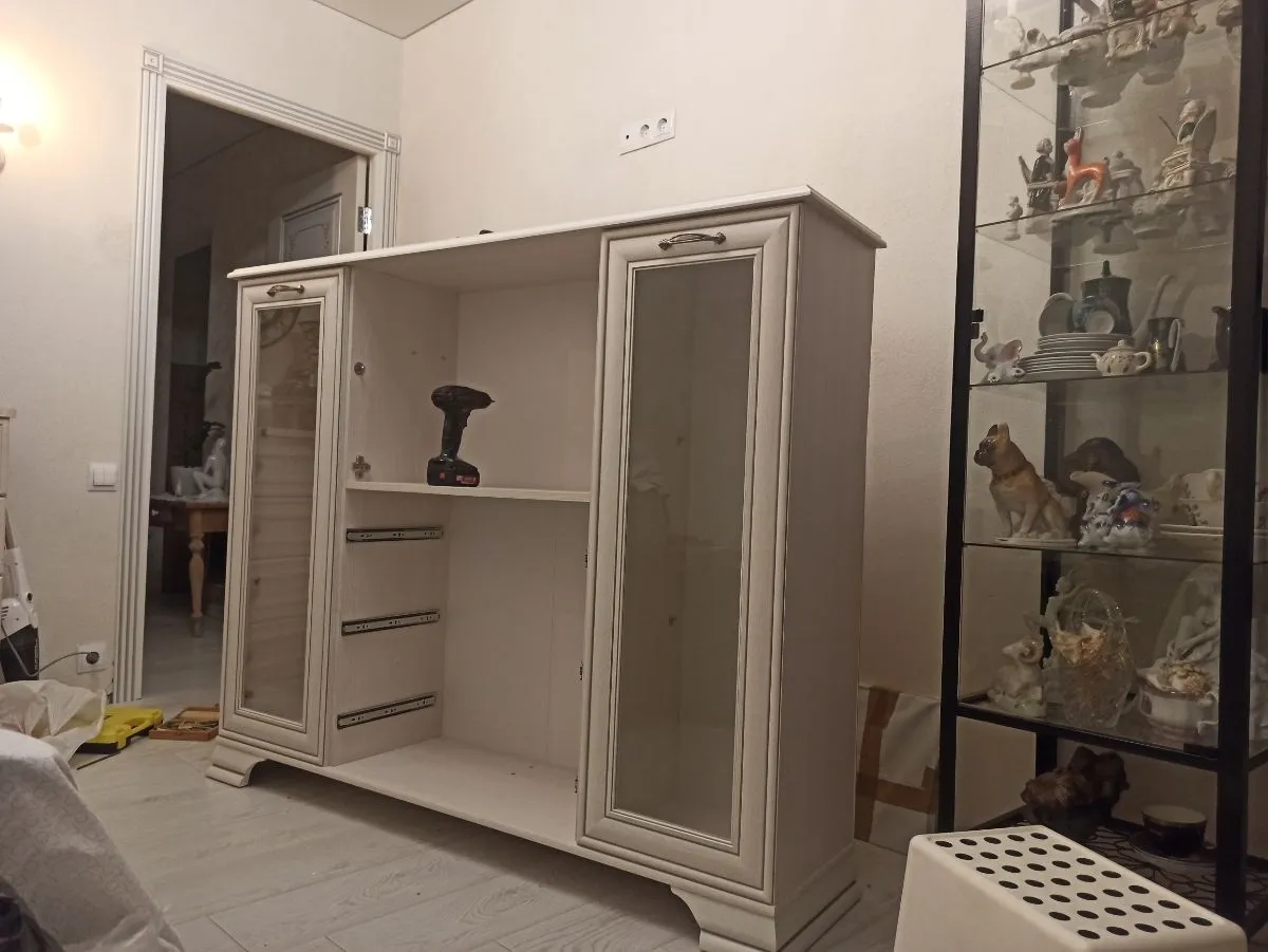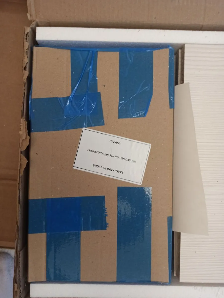 Товар пришёл быстрее чем обещали. Всё хорошо упаковано. Две коробки были немного поцарапанные, зная что внутри есть стекло, я захотела убедиться что оно цело. При мне ребята вскрыли коробки и всё провертли. Стекла целы. Читала в отзывах что нет инструкции, в моих упаковках она есть. Цвет почти Белый. Оттенок больше уходит в розовый нежели в ваниль. При доставке все коробки занесли в квартиру. Позвонили заоанее и предупредили о приезде. Время доставки я указала сама. Есть возможность изменить и день и время. Когда комод будет собран, добавлю ещё одно фото)