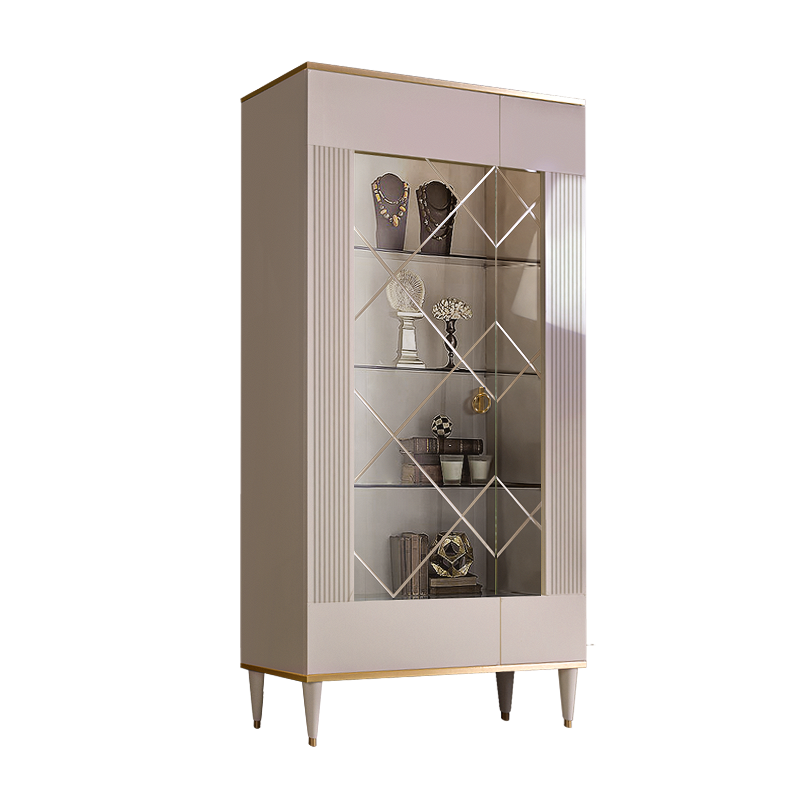 Визуально легкая и компактная витрина Rimini Solo с двумя дверцами занимает в высоту 180 см. Ее ширина составляет 89 см, а глубина – 45 см. Оптимально для размещения в небольшом пространстве. Премиальный внешний вид шкафу-витрине придают конусообразные ножки с отделкой латунью. Проходящая по правой стороне декоративная фрезерованная я вставка и ручки-кольца под золото или серебро делают конструкцию особенно запоминающейся.