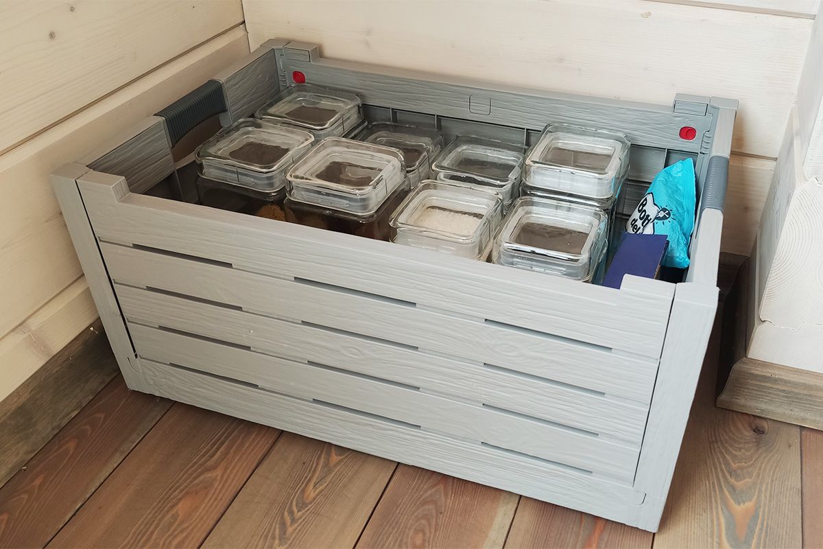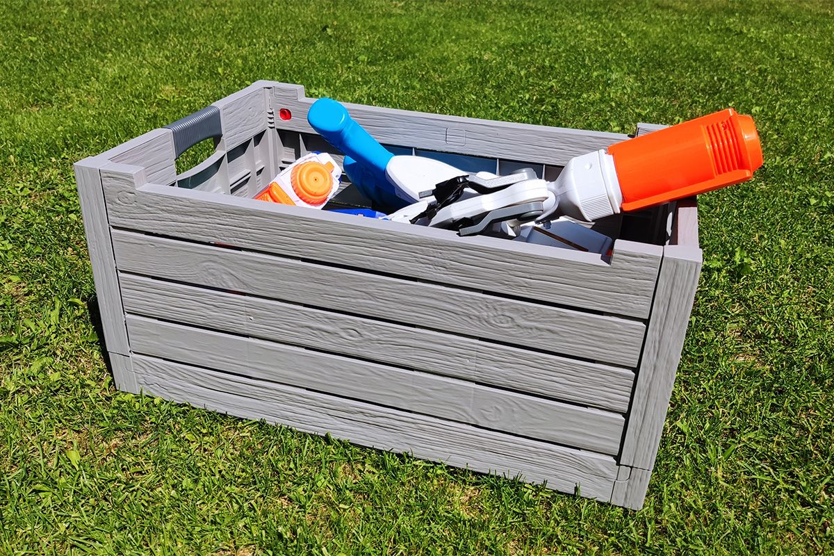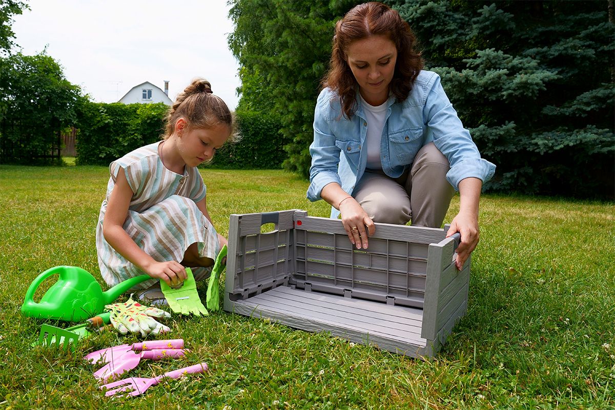 Прочный складной пластиковый ящик для сада с деревянной отделкой, резиновой ручкой и нескользящими ножками.