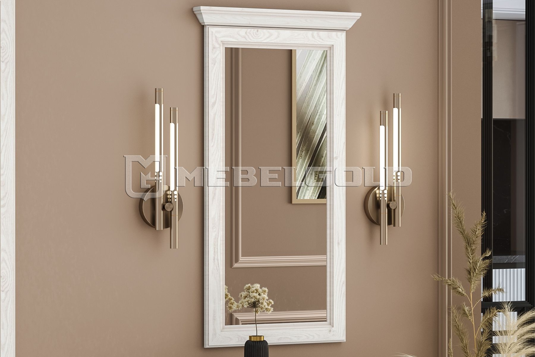 Белая рамка зеркала с фигурным карнизом и фактурой состаренного дерева станет красивым акцентом в интерьере. Здесь нет кричащих цветов и причудливого декора, его место заменяет умеренный дизайн без излишеств. Главное правило при уходе за рамой: не допускать ее переувлажнения, а также контактов с кислотами и щелочами.